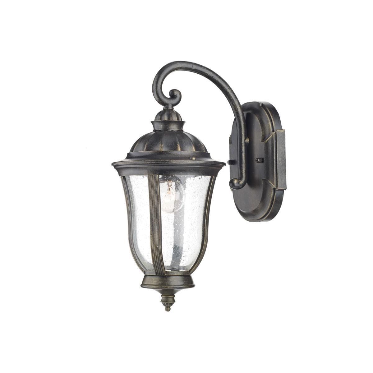 Antique style seeded glass panels and elaborately moulded metal work in a complimentary black/gold finish, combine to make the JOHNSON Outdoor Wall Light a beautiful light; perfect for any traditional home. IP44 Rated for use outdoors.