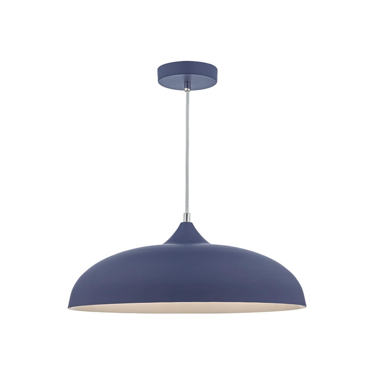 KAELAN is a clean lined pendant with a graceful shallow curve and simple cable suspension. It comes in matte blue with a white inner and suspended from a clear cable. This modern style pendant casts a great light.