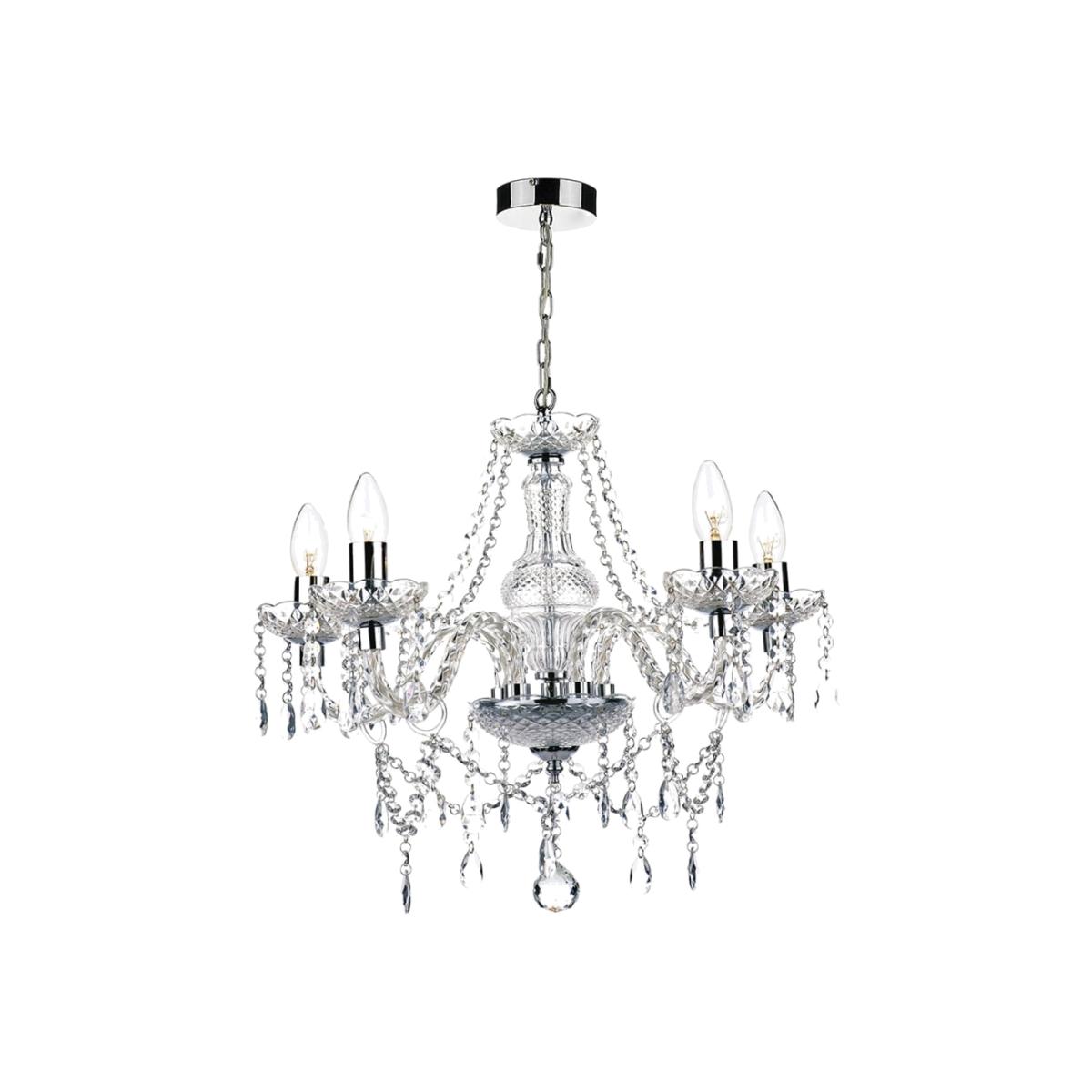 Enhanced by pear-shaped crystal droppers and draping beads, the KATIE Chandelier will look sensational in practically any room in your home. The fitting is fully height adjustable at point of installation. Colour: Chrome. Material: Metal. Maximum Bulb Wattage: 40. Bulb Included: No. Number of Bulbs: 5.