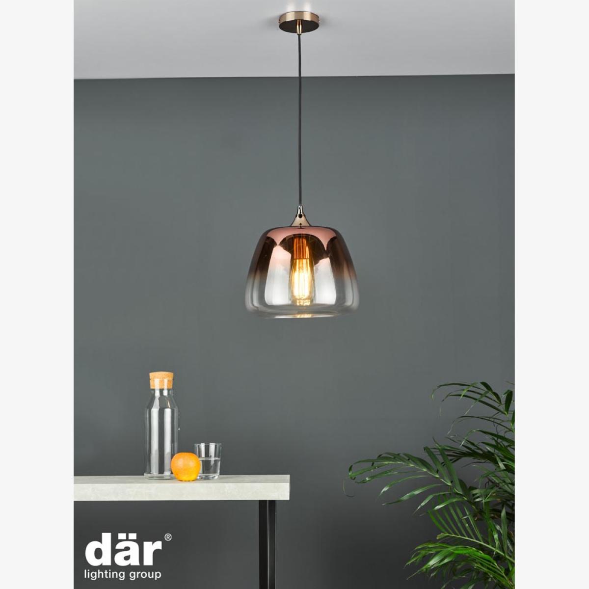 The Klaxon single pendant features a modern glass shade finished in a rich copper ombre fading to clear. The ombre glass is a bit of a favourite of ours, it allows a lot of light out but also helps stop the glare associated with clear glass. Fitted with 1m of black fabric covered cable which is adjustable on installation. This lamp looks best with our small globe or rustika filament LED lamps (sold separately). Colour:Copper Glass. Lamp Holder Type: E27. Bulb Type: GLS. Maximum Bulb Wattage: 60. Bulb Included: No.