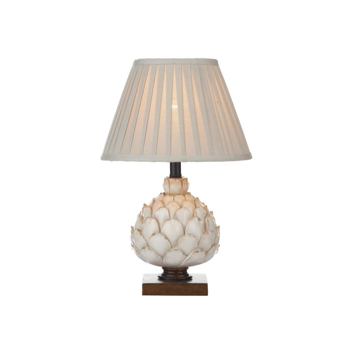 The small Layer table lamp features a hand finished artichoke inspired base in distressed cream with bronze accents. It sits on a square, mottled gold wooden plinth. This must-have table lamp comes complete with an elegant pleated Empire shade covered in sheened stone-coloured cotton with a metallic bronze lining.