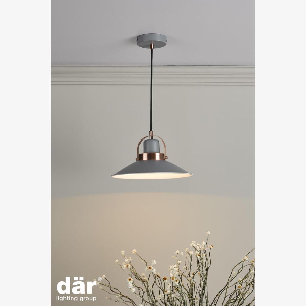 The Liden single pendant features an angular matt grey painted metal shade with copper detailing and matching ceiling plate, offering a more contemporary industrial look. Fitted with a complementing black braided cable which is height adjustable on installation to a minimum height of 27cm (max 120cm), making it suitable for most ceiling heights. Colour: Matt Grey. Lamp Holder Type: E27. Bulb Type: GLS. Maximum Bulb Wattage: 40. Bulb Included: No.
