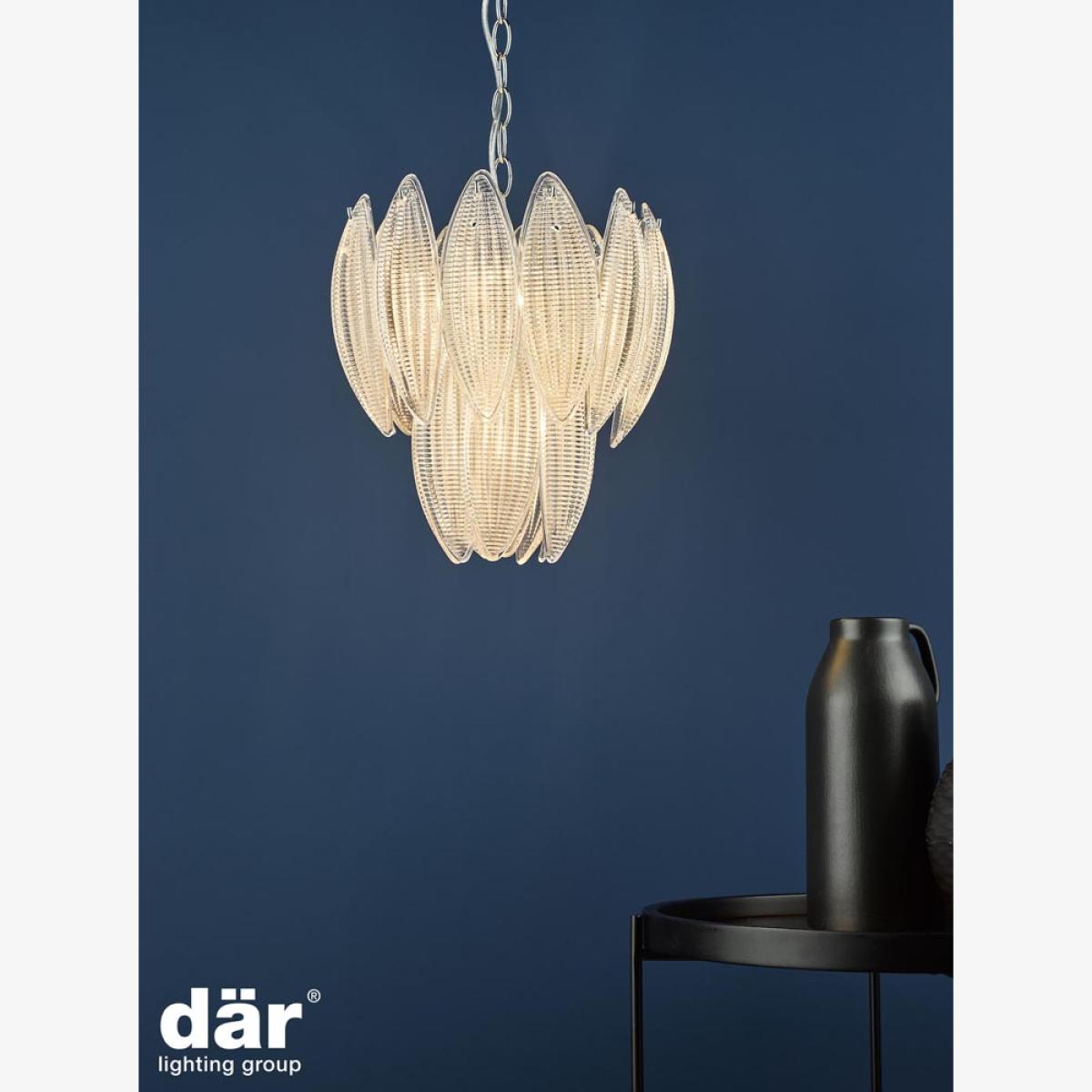 TheMaeve 6 light pendantis a contemporary glass ceiling light. Inspired by a lotus flower, the textured glass panels really play with the light creating a sparkle as you walk around the room. The glass petals hang freely on a chrome metal frame. Fitted with 1 metre of chain which can be adjusted during installation. Colour: Polished Chrome. Lamp Holder Type: G9. Maximum Bulb Wattage: 25. Bulb Included: No. Number of Bulbs: 6.