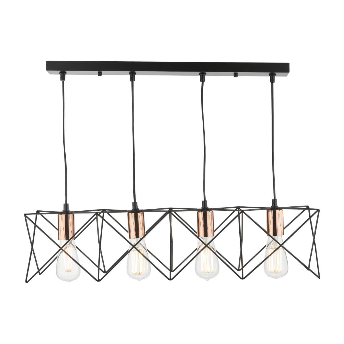 The geometric Midi 4 light over-table bar pendant is a compact square wirework ceiling light powder-coated in matt black forming a cage for showing off 4 bright, polished copper lamp holders. This neat bar pendant light brings a touch of the industrial look yet remains fresh and contemporary in its Scandi styling. Perfect for displaying decorative bulbs, with the open metalwork frames this fitting adds ambience to vintage and modern interiors alike.