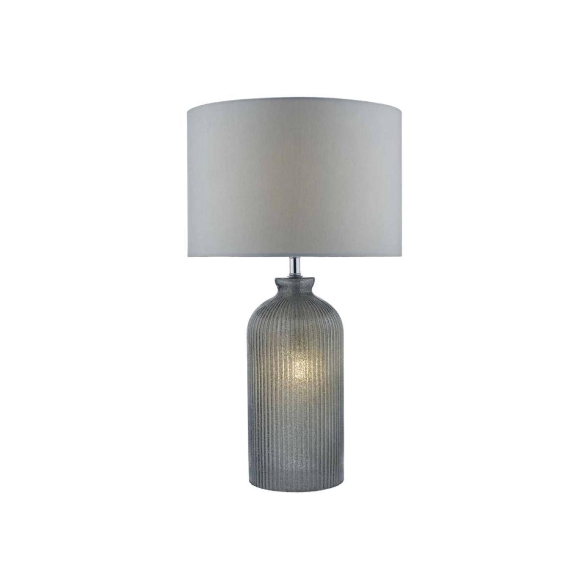 The PAMPLONA dual-source table lamp has a bottle shaped glass base in a grey finish. Lit from within, its walls are finely ribbed coated with glass flakes which add a sparkle. Supplied complete with a drum shade in grey faux silk and operated via an inline rocker switch on the cable flex.