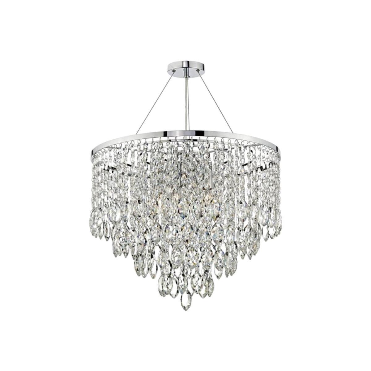 Luxury crystal pendant with beautiful faceted droppers arranged in waterfall style, polished chrome ceiling plate. 5 lights provide great sparkle for this centre piece. Height adjustable on installation. Suitable for retro fit LED lamps.
