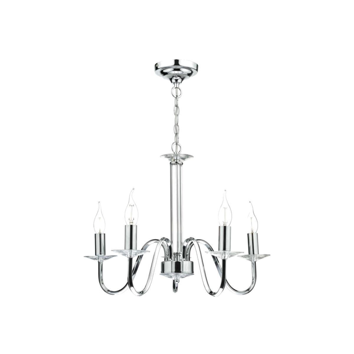 The PIQUE is a contemporary styled5 light fitting, with a graceful curved polished chrome arm andgleaming glass scones. It has a clear acrylic centre rod to reflect the light and add sparkle. The fitting is height adjustableon installation. This ceiling light looks great with a decorative lamp but also can be used with a shade to add a splash of colour ortie into any décor styling.