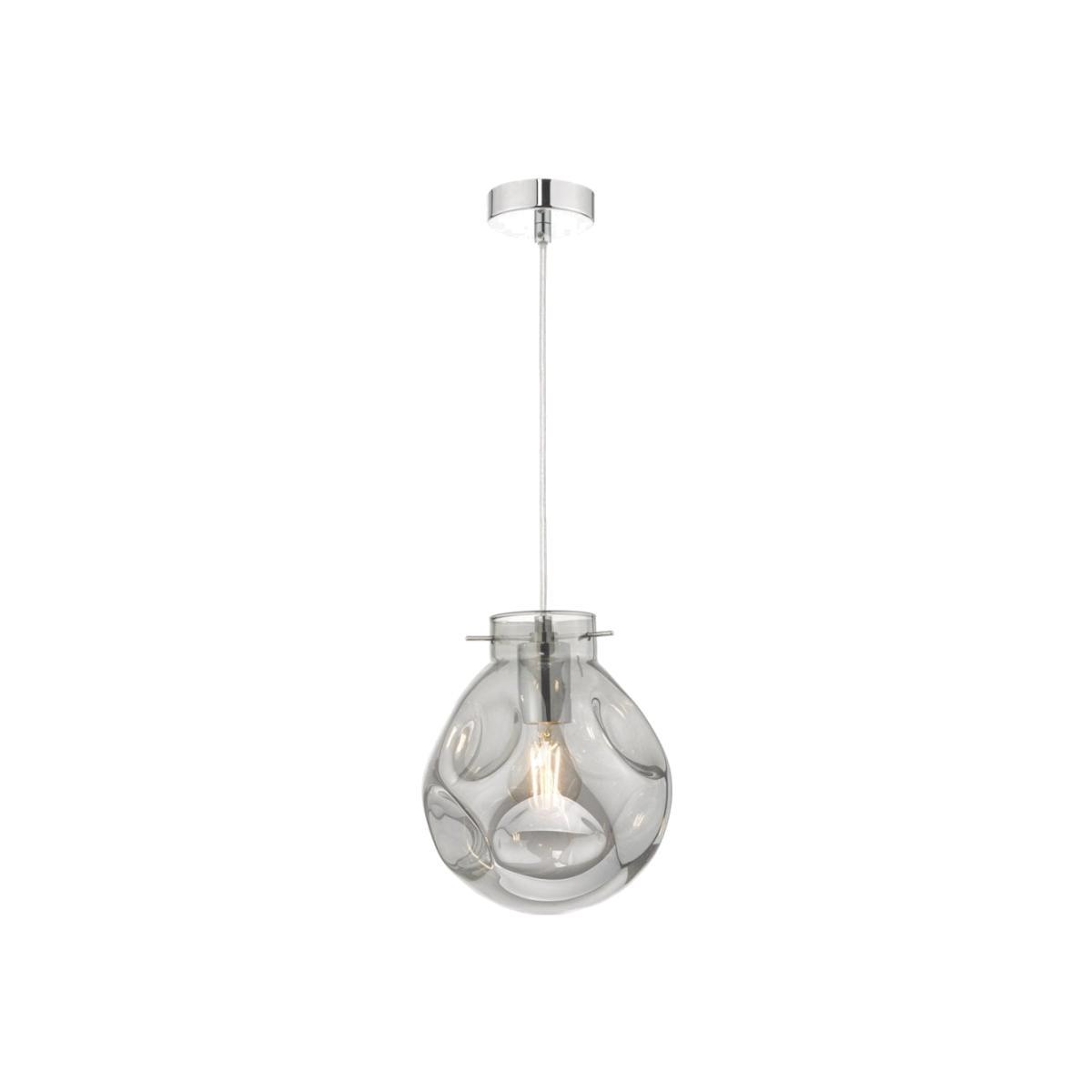 The Quinn single light pendant has an organically shaped, mouth-blown spherical glass shade with oversized dimples, in a lightly smoked finish. Paired with bright polished chrome finish metalwork, this is a unique and striking ceiling fitting, suitable for any interior space.