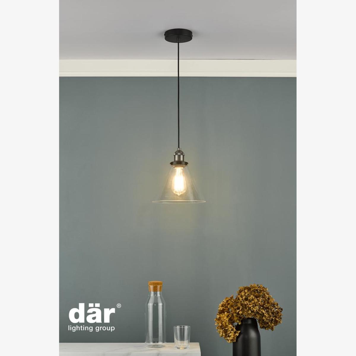 The Ray single light pendant offers up the industrial style, combining antique nickel metalwork with matt black detail and a conical clear glass shade that can showcase decorative light bulbs; the Ray looks great when teamed with a vintage bulb as pictured. Colour:Antique Nickel. Lamp Holder Type: E27. Bulb Type: GLS. Maximum Bulb Wattage: 40. Bulb Included: No.