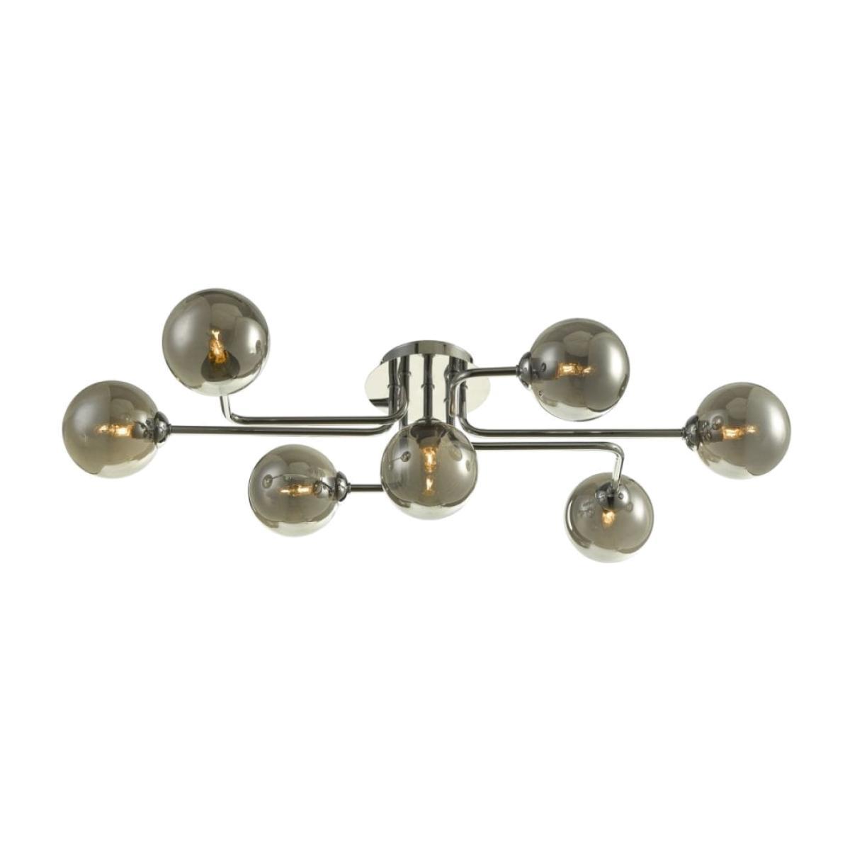 The Reyna 7 light semi flush ceiling light in polished chrome with smoked glass shades. The linear proportions of the Reyna semi flush make it ideal for long rooms such as hall ways living rooms and kitchens, the smoked glass shades are highly reflective giving an almost mirror like appearance when off and lighting with reduced glare when on.