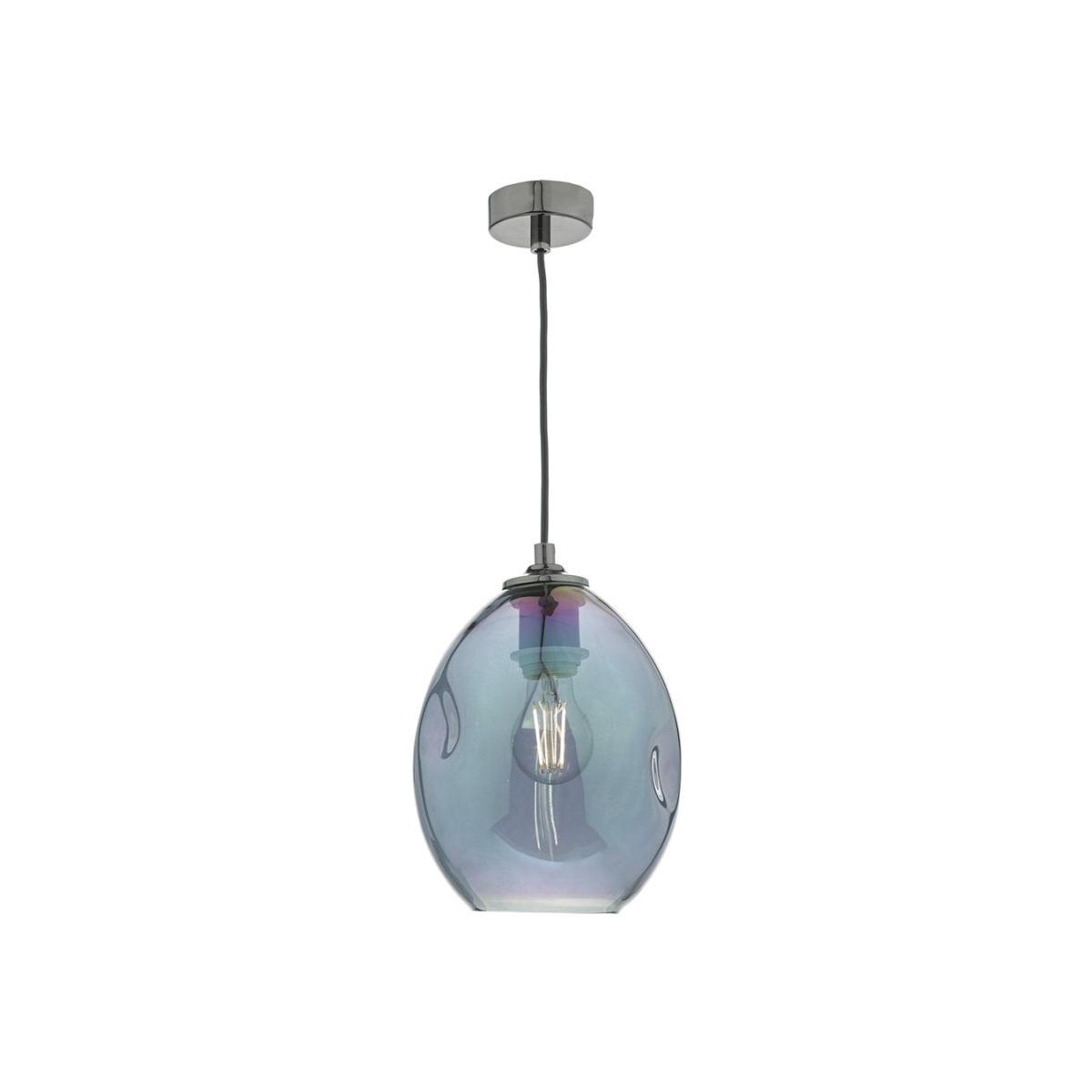The ROGAN blown glass pendant has an organic form with an oil/iridised finish and black nickel metalwork.