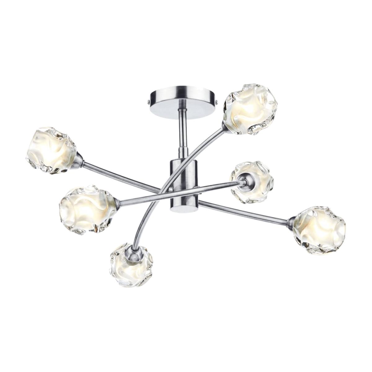 Introducing the dar Lighting SEA0646 Seattle 6 Light Semi Flush, a stunning blend of contemporary design and elegance. This exquisite light fixture features a sleek satin chrome finish that adds a touch of modern sophistication to any space. The six sculptured glass shades emit a warm, inviting glow, making it perfect for dining rooms, living areas, or hallways. The semi-flush design allows for versatile installation, suiting both low and high ceilings while maximizing illumination without overwhelming your decor. Each glass shade is meticulously crafted, showcasing intricate detailing that enhances the overall aesthetic. With its ability to complement a variety of interior style from minimalist to industrial—the Seattle light fixture is a versatile addition to your home. Easy to install and maintain, the SEA0646 combines functionality with elegant design, ensuring your space remains bright and beautiful. Illuminate your home with this captivating fixture, and experience the perfect fusion of style and practicality.