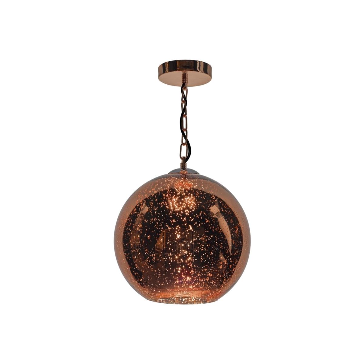 SPECKLE is a gorgeous glass globe of dappled, speckled copper that when illuminated gives off a warm glowing light that adds oodles of atmosphere to any interior. Matching ceiling plate with 1 metre of chain and on a bright copper base and finished with luxury black braided cable. Colour: Copper Glass. Lamp Holder Type: E27. Bulb Type: GLS. Maximum Bulb Wattage: 40. Bulb Included: No.