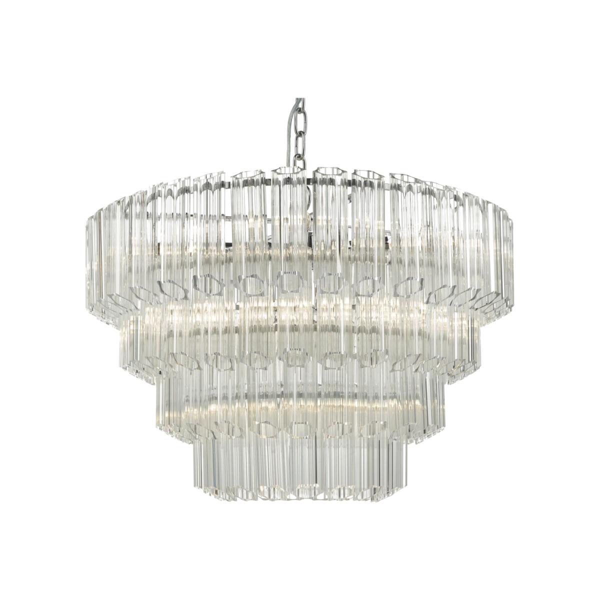 Elegant design with graceful style; the theatrical Tuvalu from dar Lighting is a charming statement piece that’s resonant with the Art Deco period. Dressed with over 100 pieces of tubes of heavy fluted glass cut at angles to soften the outline, the Tuvalu is an impressive 4 tiers, illuminated by 9 lights. With a long chain, you could hang this impressive light in a double height room or stairwell for all round oohs and aahs. Colour: Glass. Lamp Holder Type: E14. Bulb Type: Candle. Maximum Bulb Wattage: 40. Bulb Included: No.