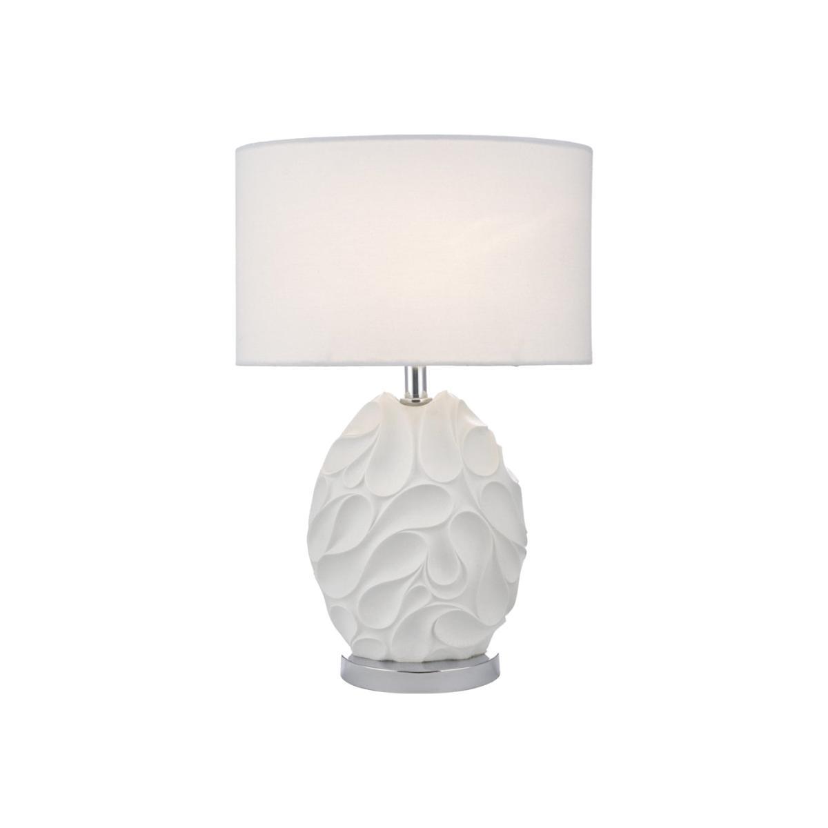 The ZACHARY is a family of sculptural table lamps formed in resin. The dramatic undulating texture is balanced by the matte white finish, showing subtle curved shadows cast from the lamp above. Available in oval and round bases, supplied complete with white linen shade and polished chrome detailing at the base and neck.