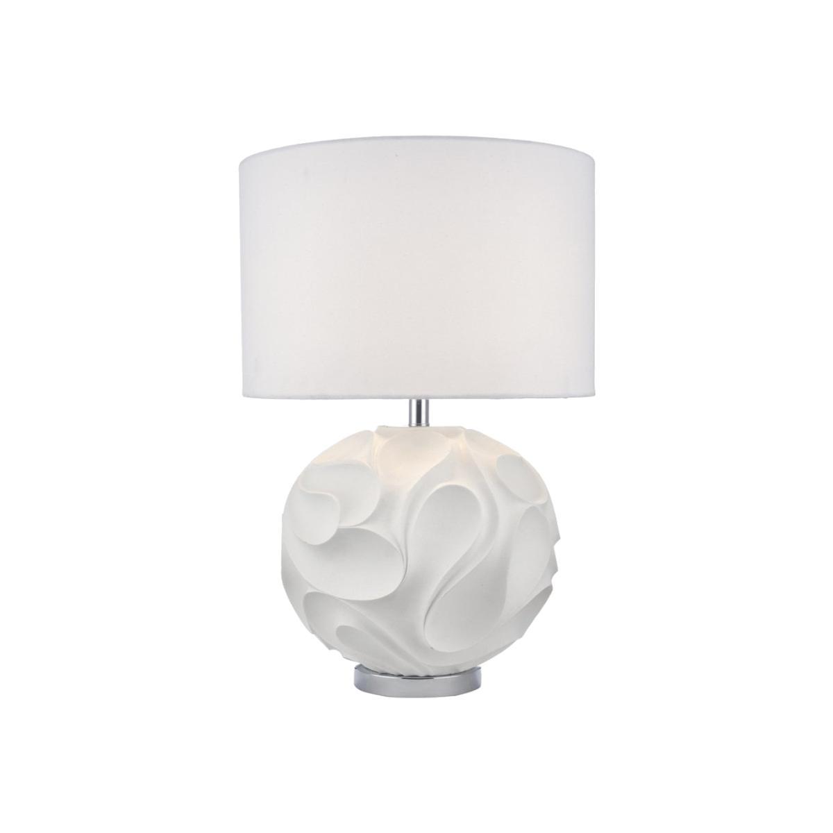 The ZACHARY is a family of sculptural table lamps formed in resin. The dramatic undulating texture is balanced by the matte white finish, showing subtle curved shadows cast from the lamp above. Available in oval and round bases, supplied complete with white linen shade and polished chrome detailing at the base and neck.