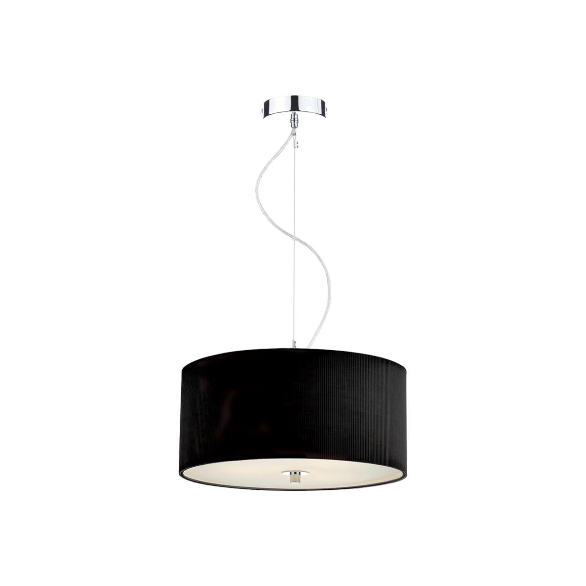 The ZARAGOZA 40cm 3 Light Pendant has a polished chrome ceiling plate and comes complete with a black micro pleat shade and acrylic diffuser. The pendant is supplied with 150 cm cable and can be adjusted for height at point of installation. Colour: Black. Material: Fabric. Bulb Type: GLS. Maximum Bulb Wattage: 60. Bulb Included: No.