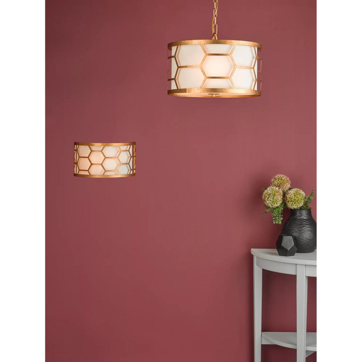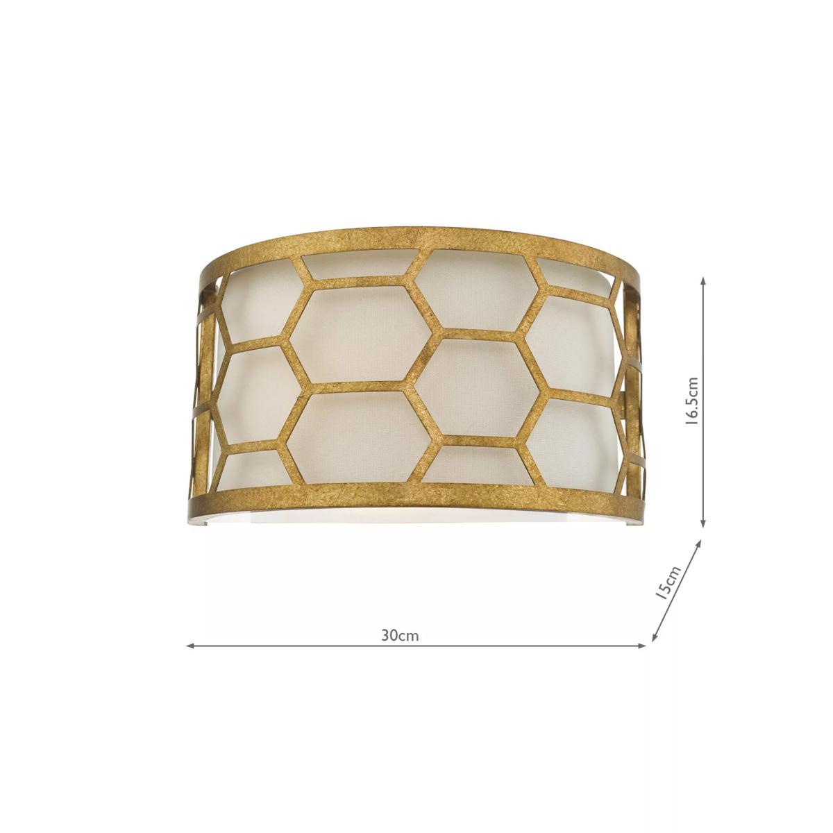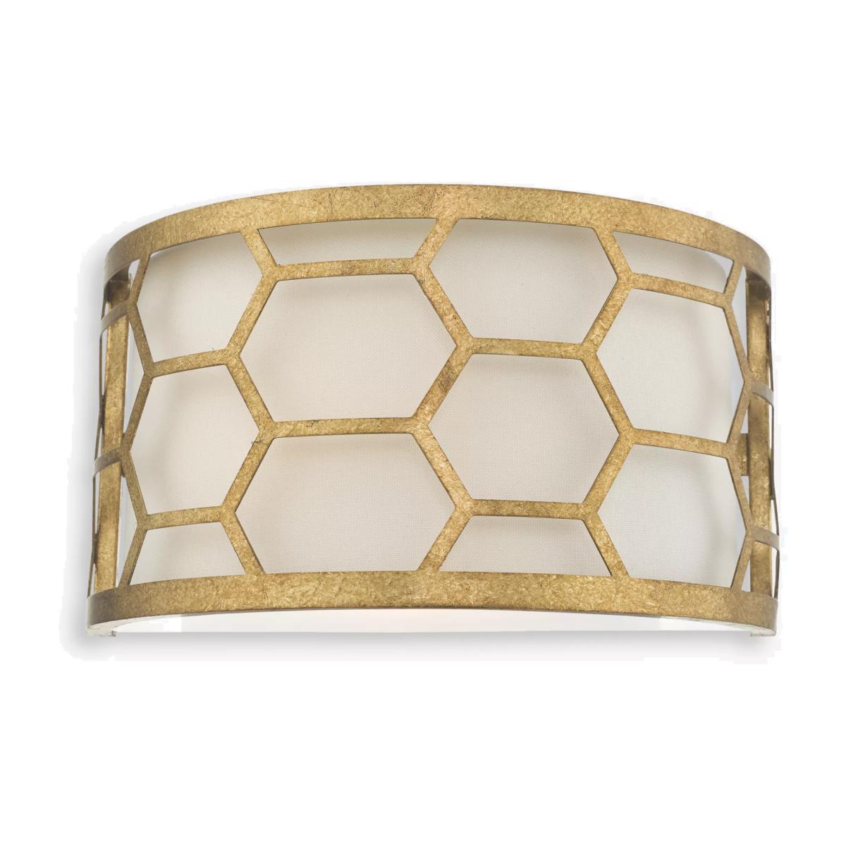 In a honeycomb design, this wall light from Där is finished in hand-applied, distressed gold leaf. The ivory linen shade and tempered glass diffuser soften the light from the single bulb.