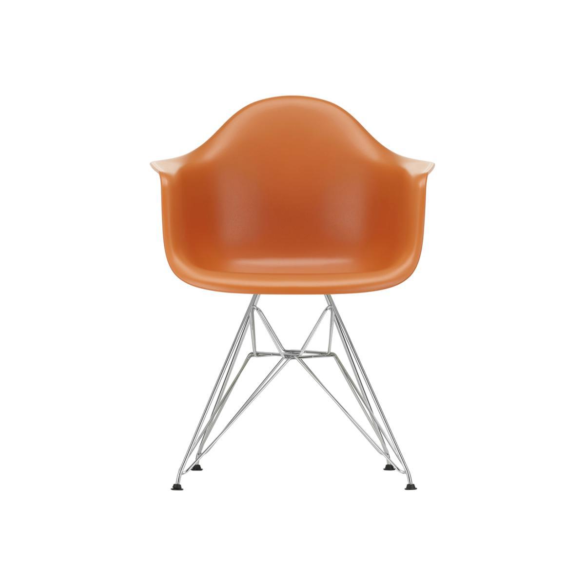Designed in 1950 by iconic duo Charles and Ray Eames for Vitra, the DAR Plastic Armchair in rusty orange showcases the signature 'Eiffel' chrome base and a refreshed colour palette for 2019, paying homage to the model's original colour history while acknowledging future aspirations. Crafted from recyclable dyed-through polypropylene for greater comfort, the seat sits on a striking chrome-plated wire base with cross struts. The first industrially produced plastic chair, the DAR Chair has a simple and organic shape that has led to its legendary status and universal appeal. Updated in 2016, Vitra added 2cm to the height of the chair and revised the geometry of the seat for optimum ergonomics and comfort.