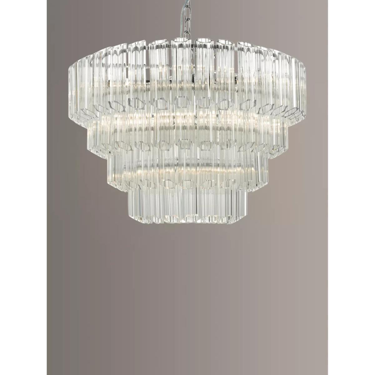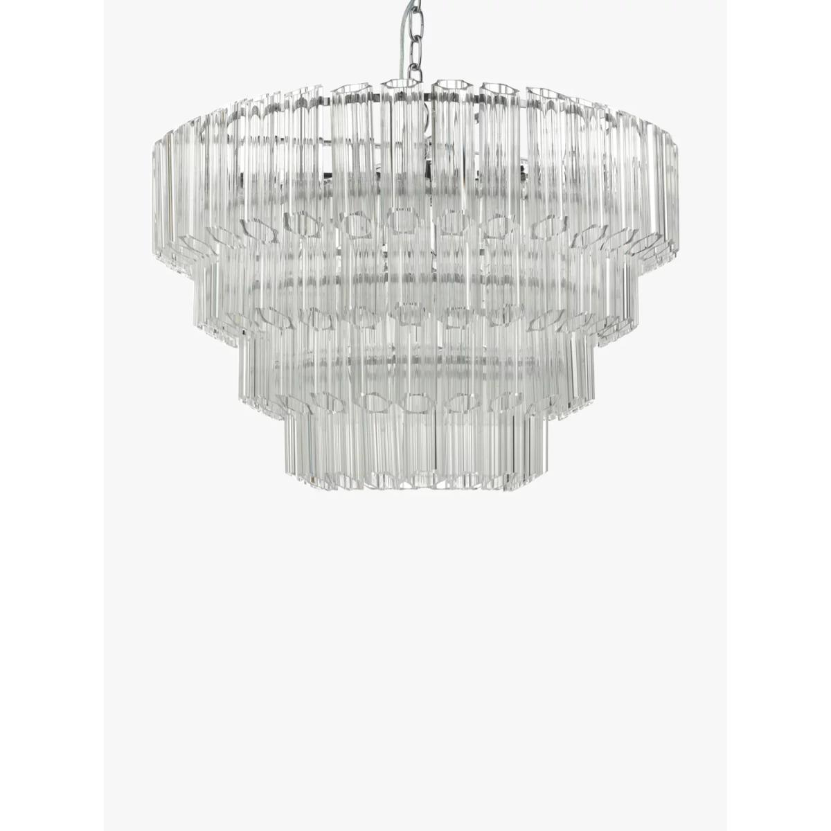 Art Deco-inspired, Där's Tuvalu pendant ceiling light is a contemporary design with four elegant tiers of glass. The light is made up of over 100 pieces of heavy fluted glass with nine bulbs creating plenty of light. This light is height-adjustable to suit your room.
