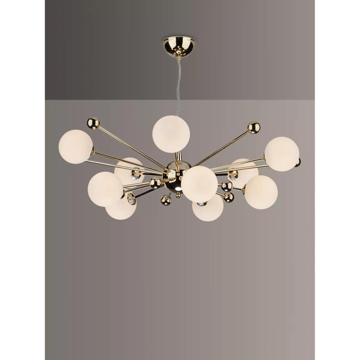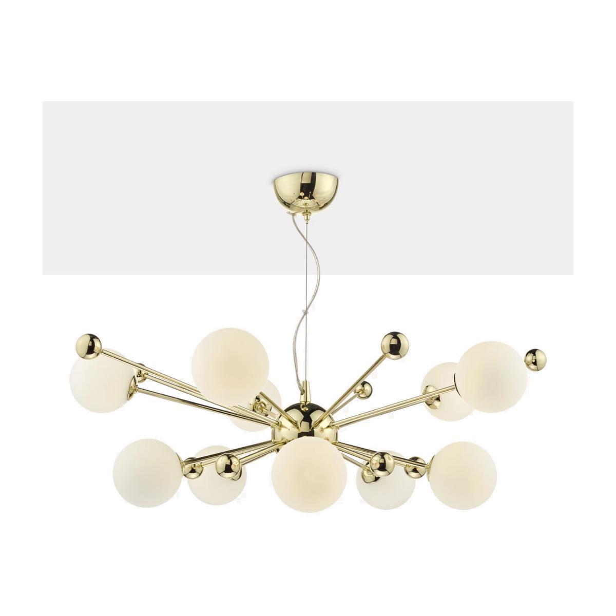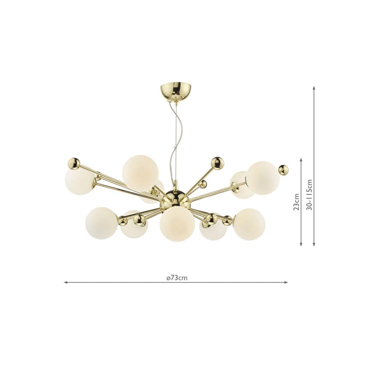 Let this oversized ceiling light become the focal point in your space. Height-adjustable upon installation, it has ten large opal glass globe shades suspended from a polished gold frame. It will cast a glow of light around your room.