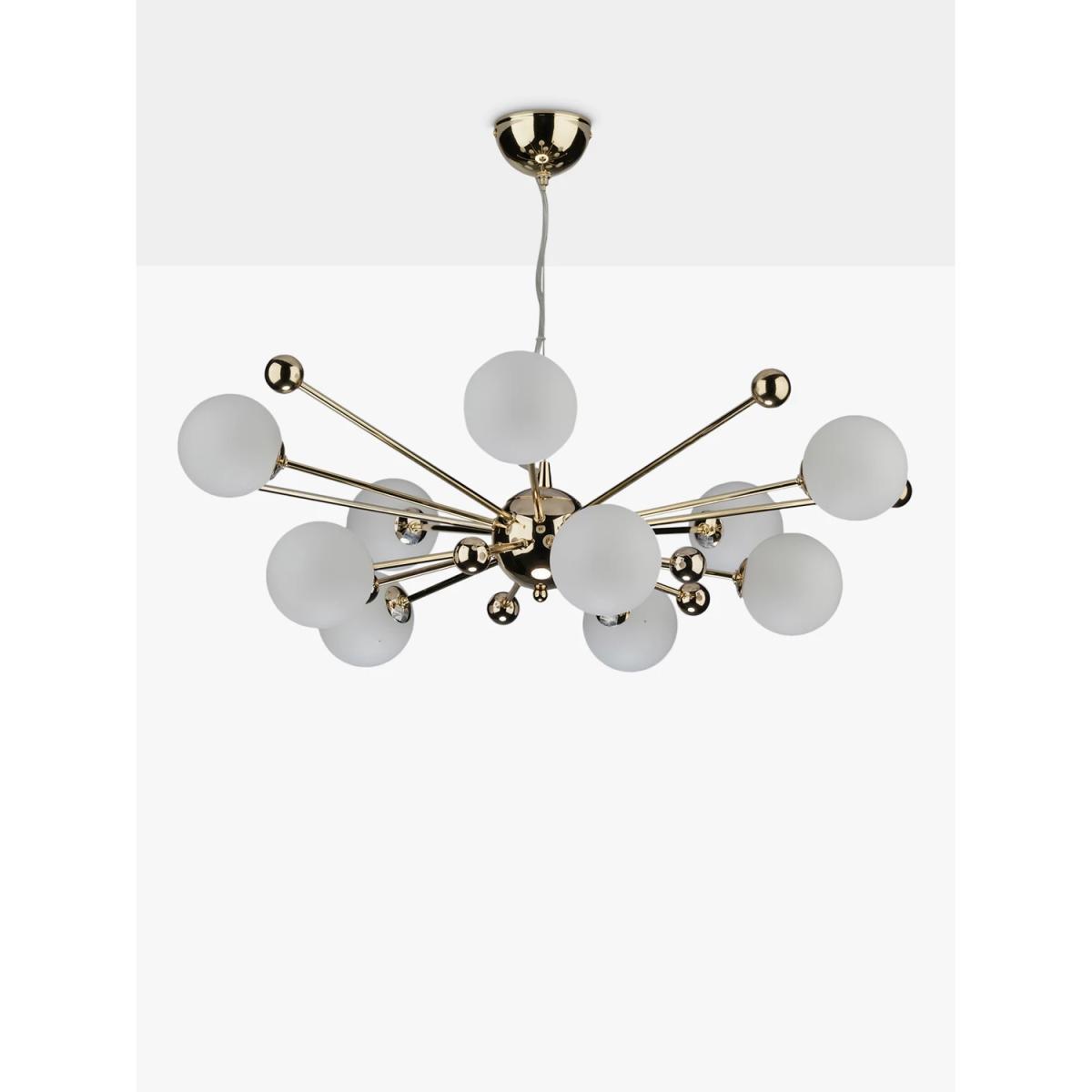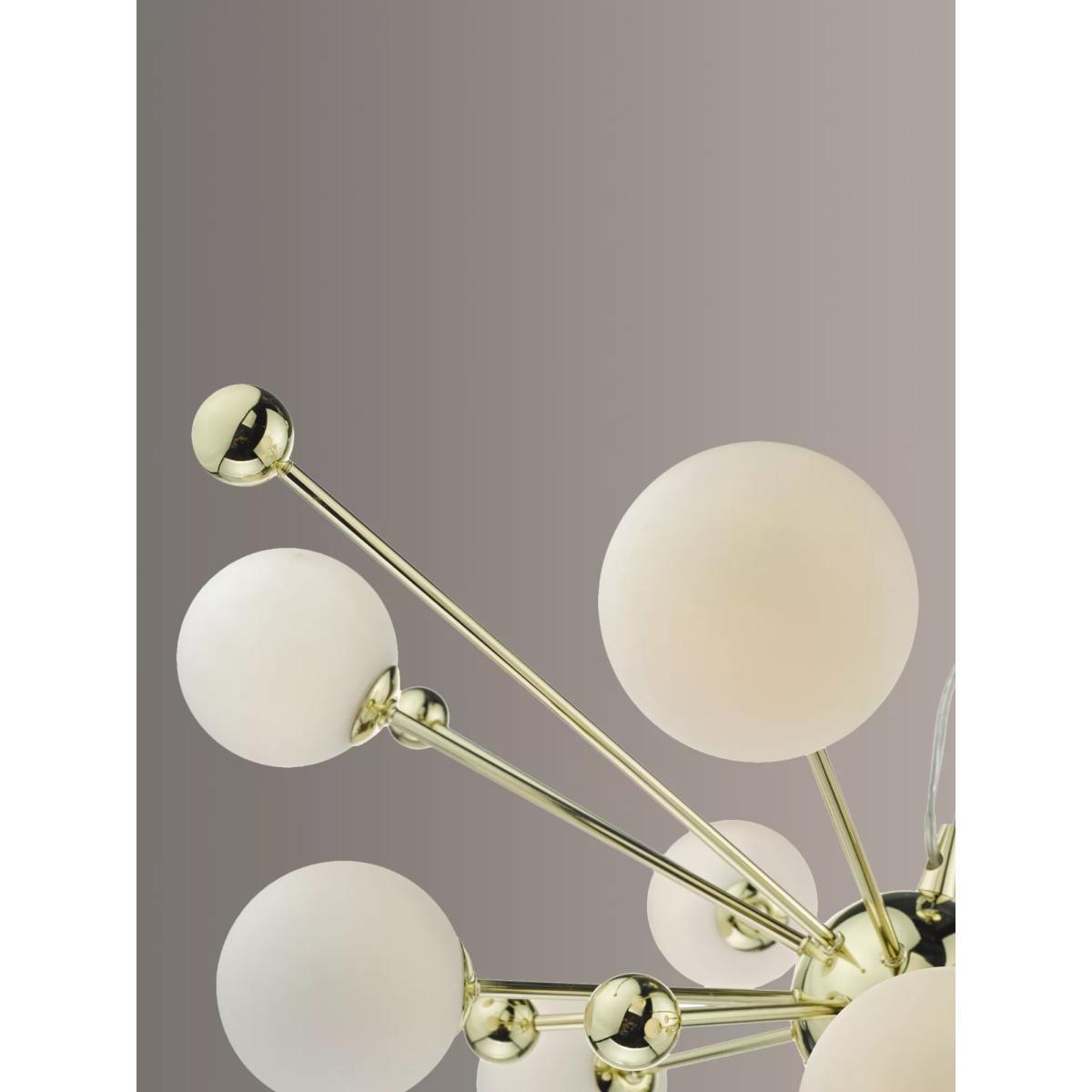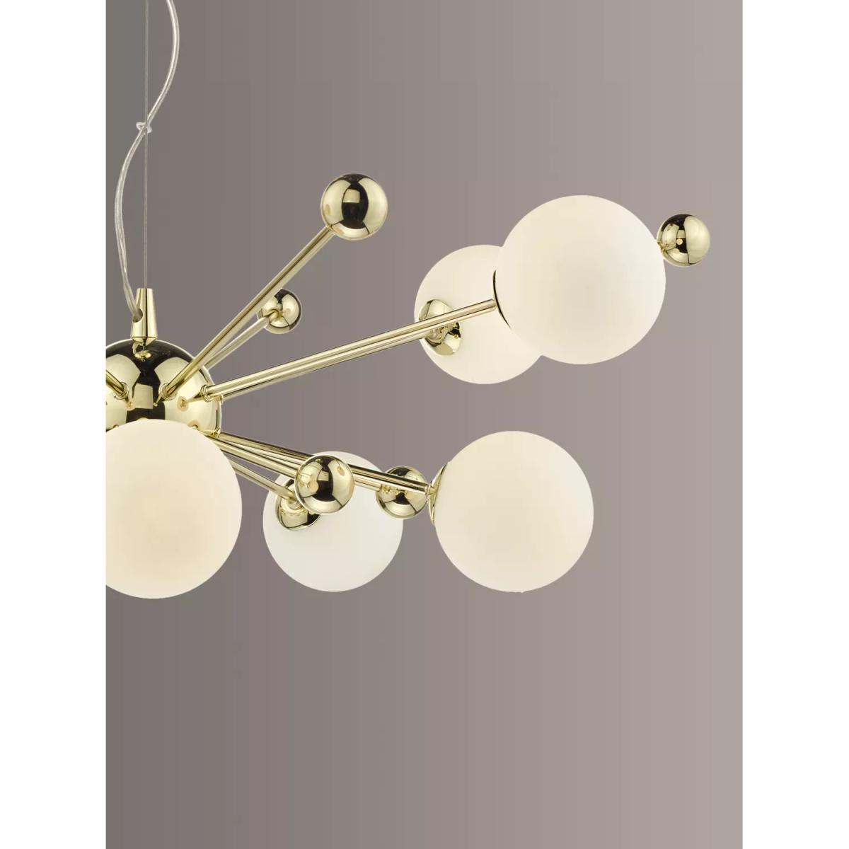 Let this oversized ceiling light become the focal point in your space. Height-adjustable upon installation, it has ten large opal glass globe shades suspended from a polished gold frame. It will cast a glow of light around your room.