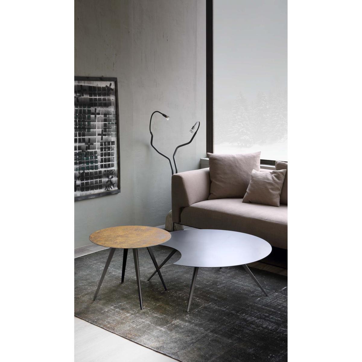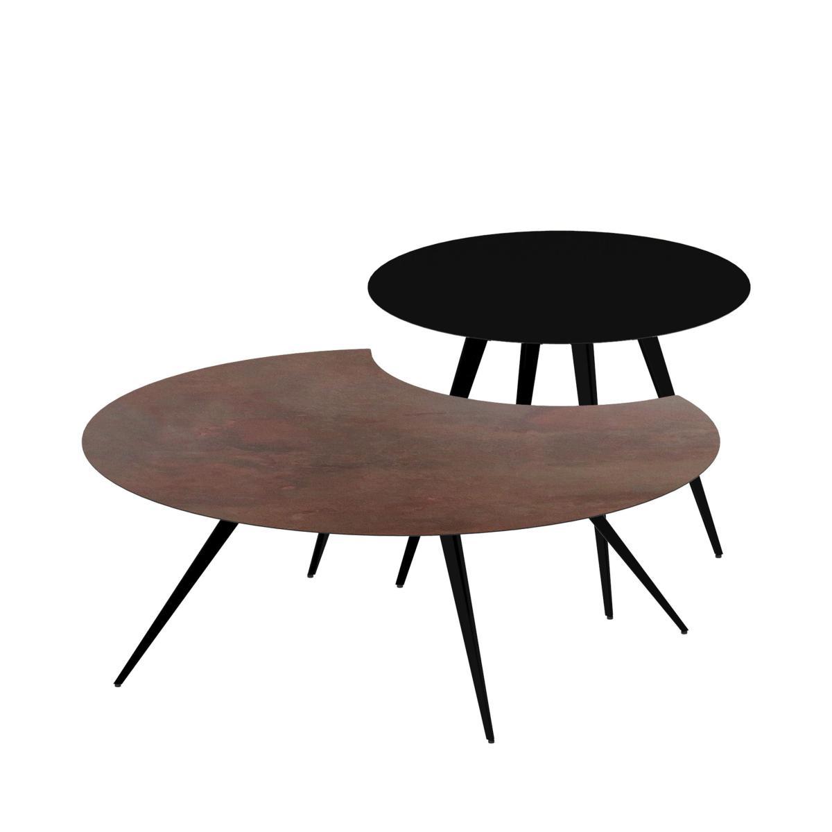 Lara & Dara are tables which go together! These two coffee tables with gentle and modern forms are available in different sizes and materials, with the option of being combined together. Once reunited, Lara & Dara match perfectly, enhancing your room thanks to their elegance and unique design. This Dara version (Ø 60 cm) is made up of an epoxy painted steel structure. It is topped with a fine and rounded top made from HPL with an artistic rust treatment offering a surprising result. What's more, the partially trimmed top allows for a perfect overlap with the Lara table. Both modern and sophisticated, Dara will provide character to your interior. PLEASE NOTE. The price corresponds to the cost of the Dara table on its own: the Lara table is sold separately.