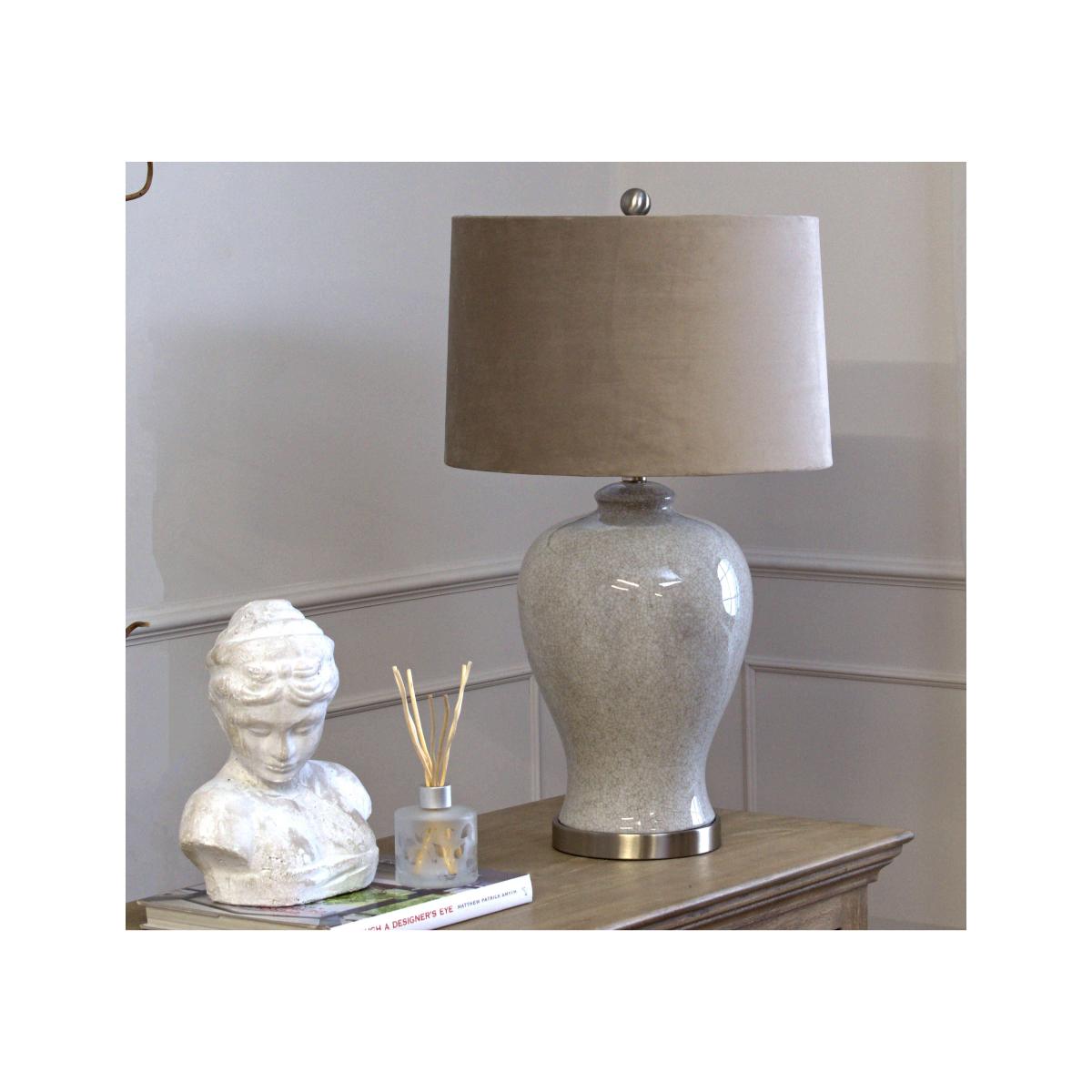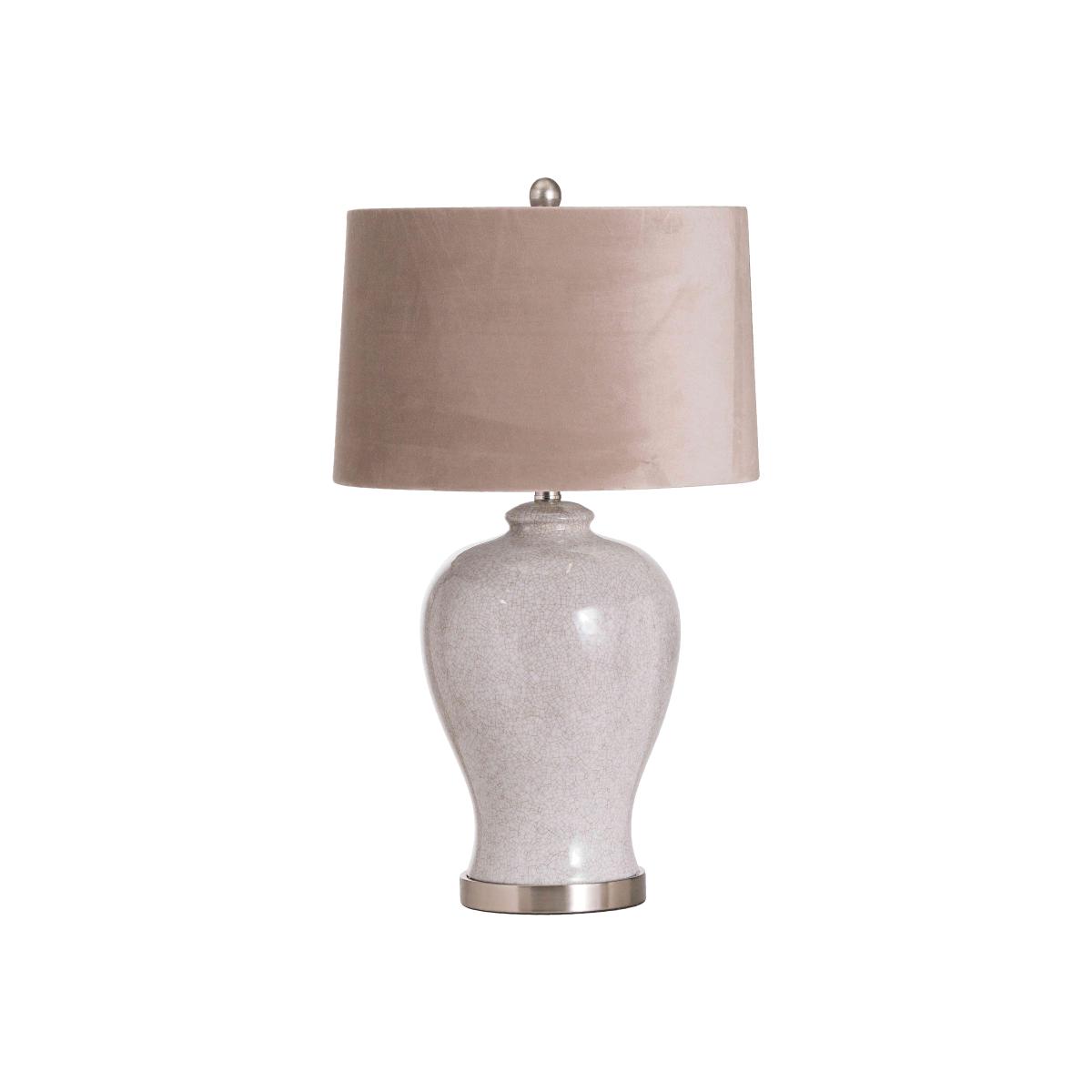 Effortlessly luxurious, our Dara table lamp combines a classic urn shape with lovely finishes – a crackle glaze on the handmade ceramic base and a velvet-textured lampshade. Why you'll love it Traditional urn-shaped table lamp is quietly sophisticated. Class elegant design. Handmade ceramic base with a crackle glaze finish. Brass-effect base, fittings and finial. Coordinating neutral velvet lampshade. This table lamp is part of the Furniture Village lighting collection. What you need to know Ceramic base. Supplied with 120 cm cable. Toggle switch. Requires 1 x E27 max. 40W bulb (not included). Dust with a soft, clean cloth. Unplug while cleaning. Base dimensions Height: 73 cm (29 in). Diameter: 40 cm (16 in). Shade dimensions Height: 26 cm (11 in). Diameter: 38 cm (15 in).