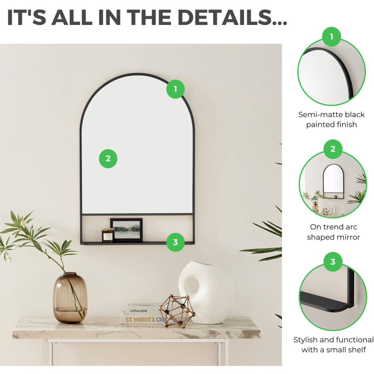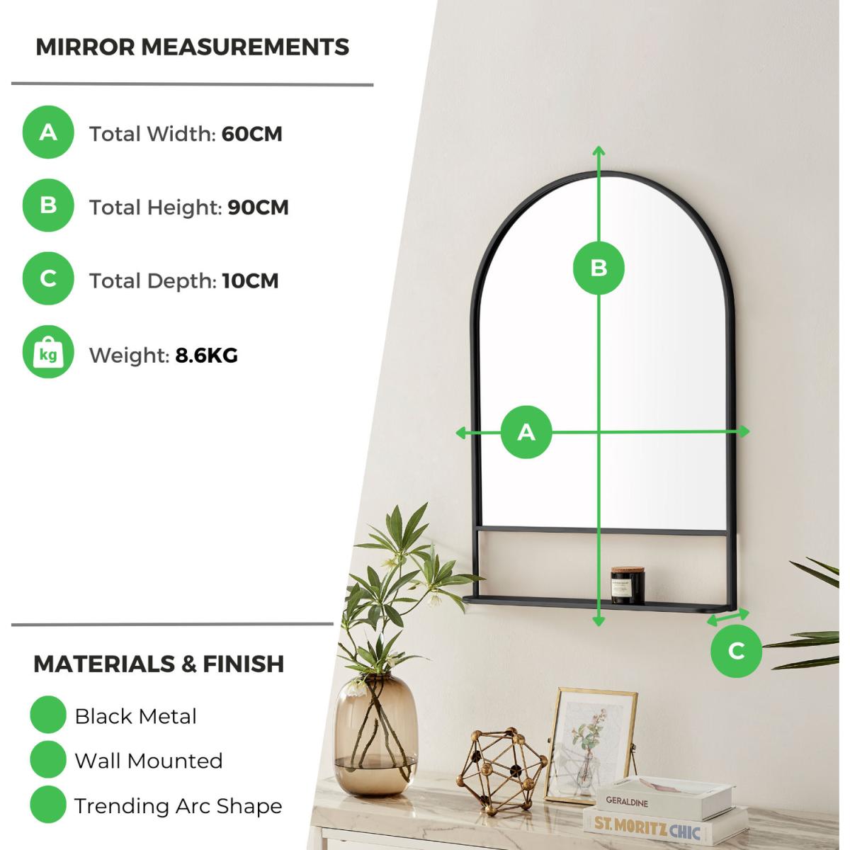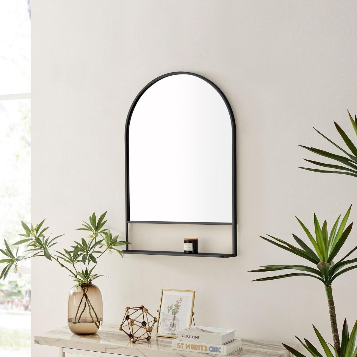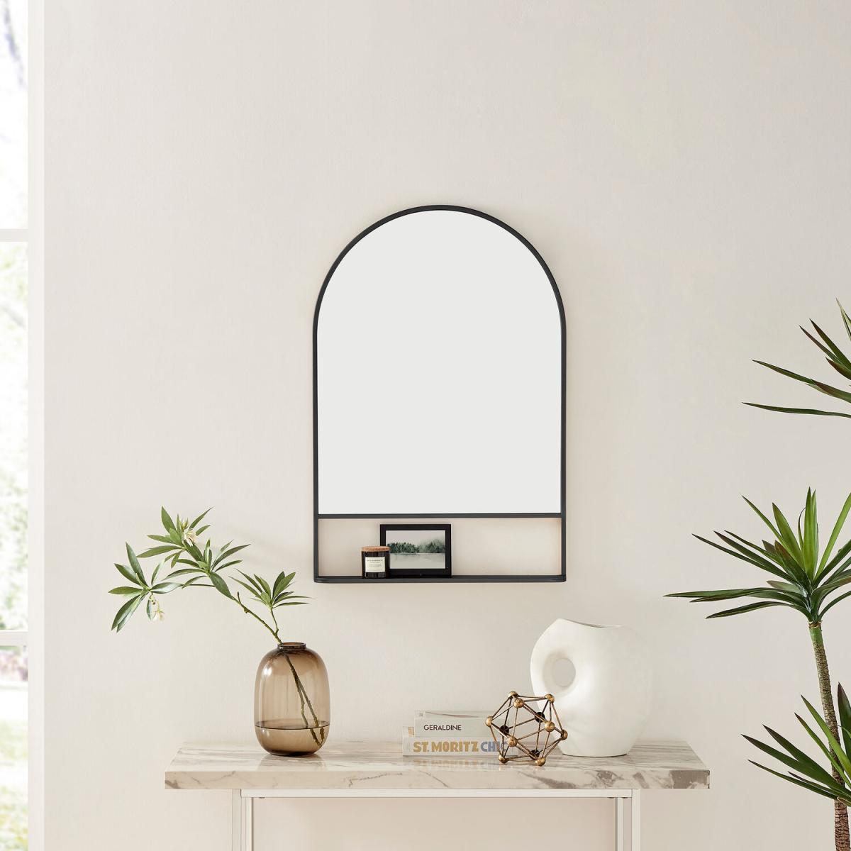 The Dara mirror brings functional sophistication to any wall in our home. This stunning mirror is crafted in India out of beautiful iron with rich mango wood or marble shelves and an elegant arched or rectangular frame shape