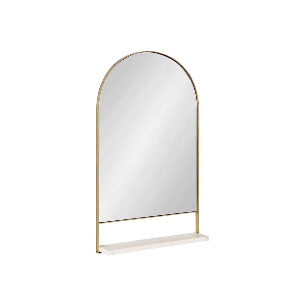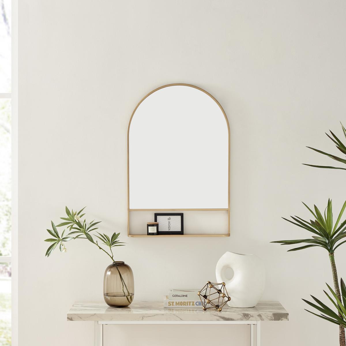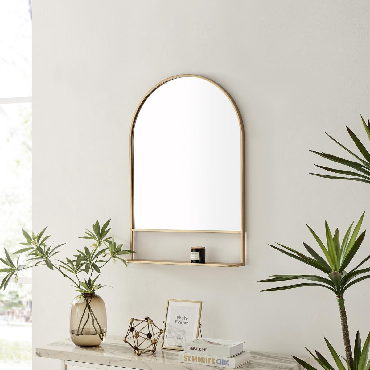 I love this mirror for its sleek, modern design and versatile functionality. The gold finish adds a touch of luxe, making it ideal for contemporary or glam interiors, but it can also elevate more eclectic or eclectic spaces when styled thoughtfully. The inclusion of a shelf provides practicality, perfect for displaying small items like keys or decorative accessories, making it suitable for hallways, bedrooms, or living areas. For styling tips, consider pairing it with warm-toned or textured accessories to complement the gold frame, and position it where it can reflect light to brighten up a space. Its clean lines and understated elegance mean it will work well in both minimalist and more maximalist schemes.