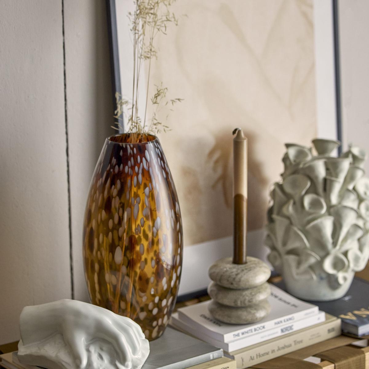 I love this brown hand-blown vase for its earthy tone and organic shape, making it a versatile piece that works well in both contemporary and rustic interiors. Its neutral hue allows it to blend effortlessly into various colour schemes, while the unique, spotted finish adds a touch of visual interest. This vase is ideal for styling with simple, understated blooms or dried botanicals, and it’s equally effective as a standalone sculptural piece on mantelpieces or side tables. To get the most out of it, consider pairing it with natural textures such as linen or wood to create a warm, inviting atmosphere.