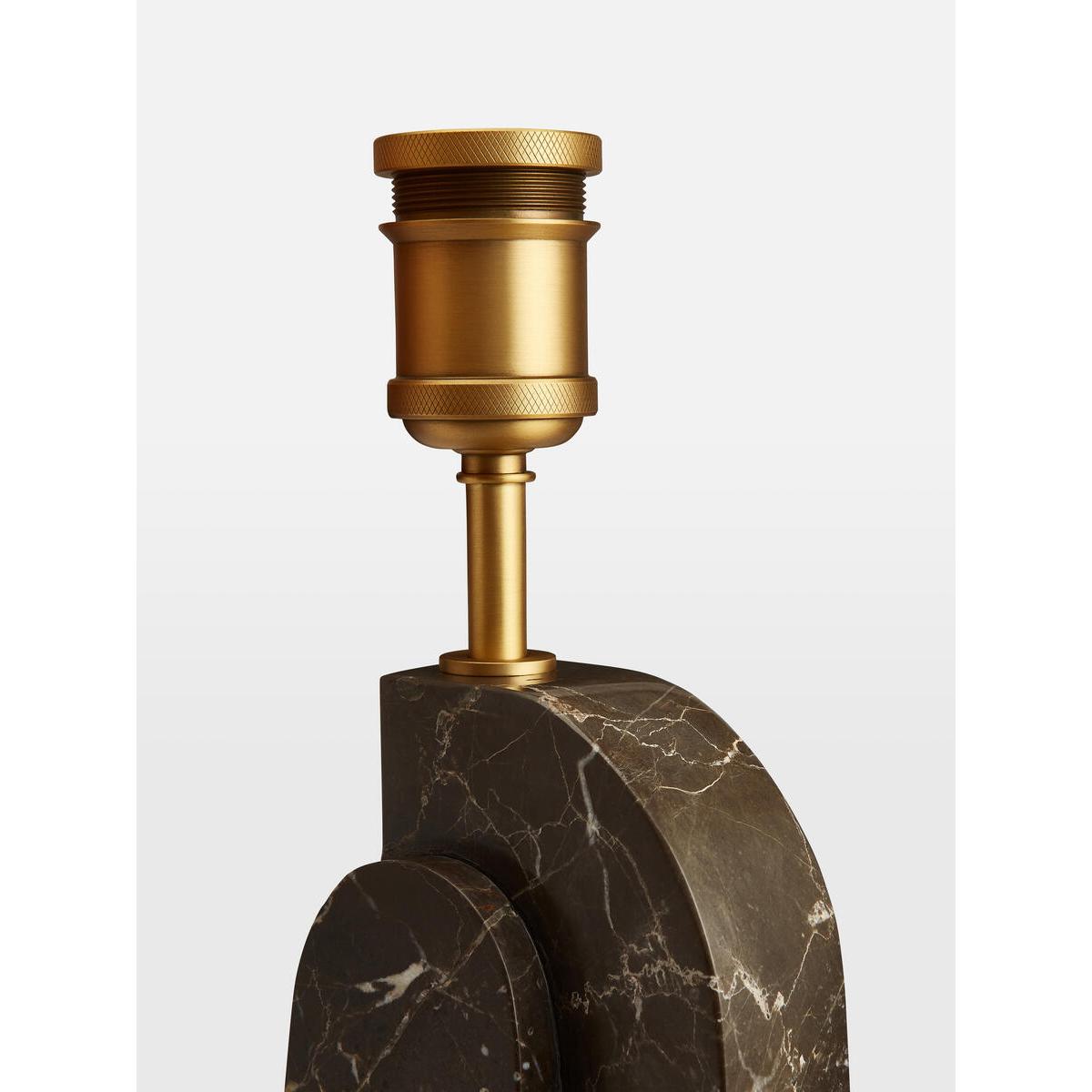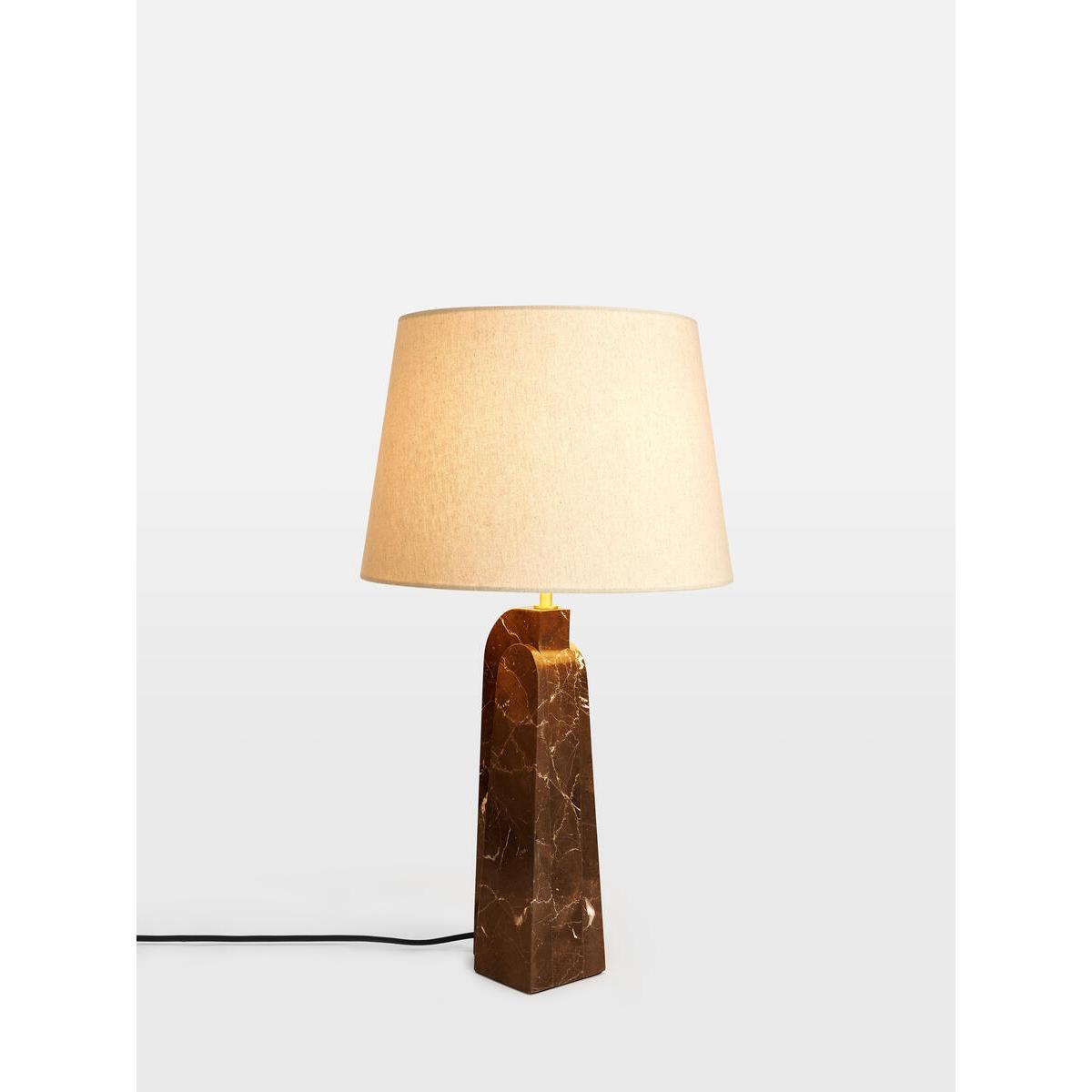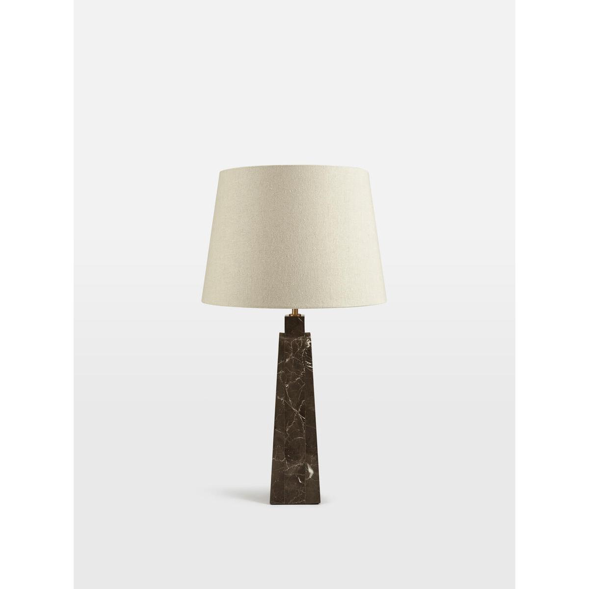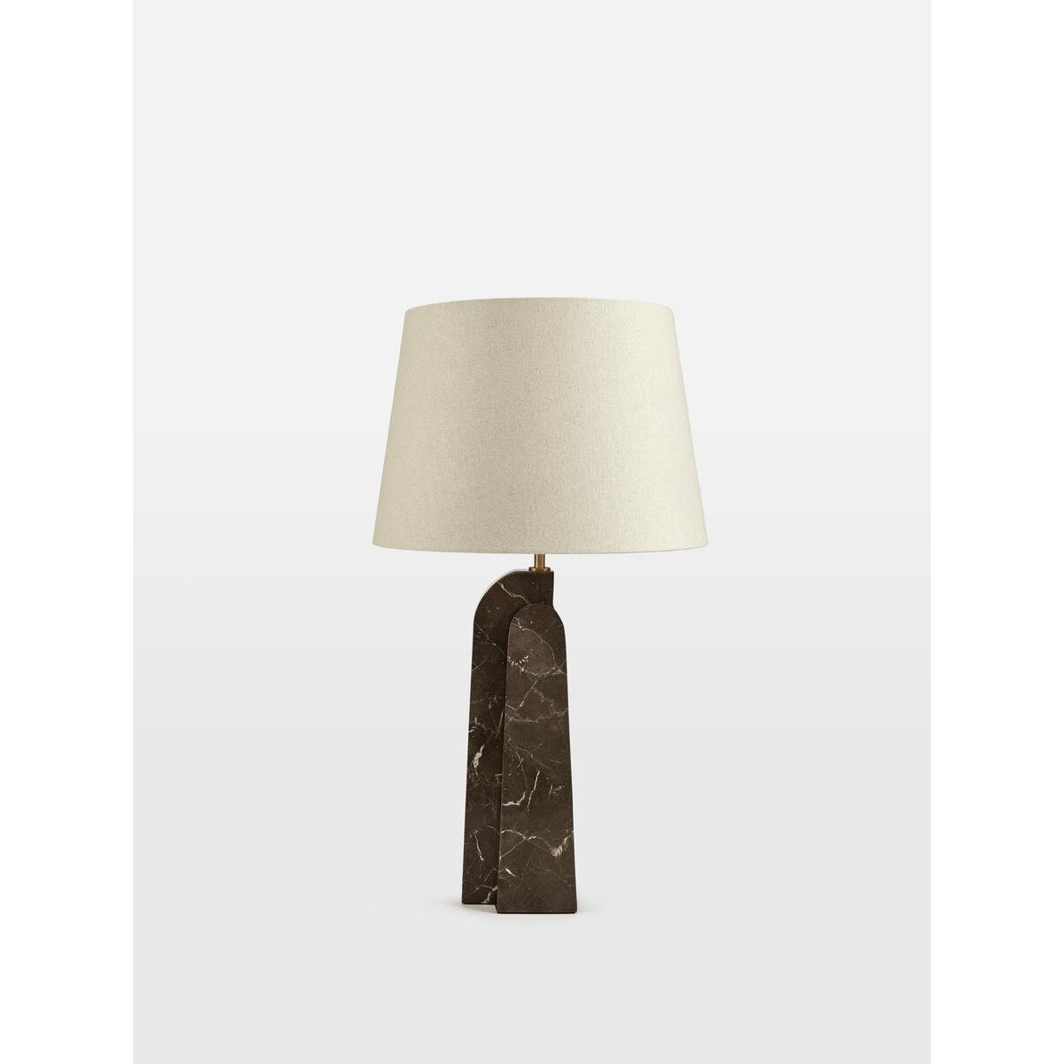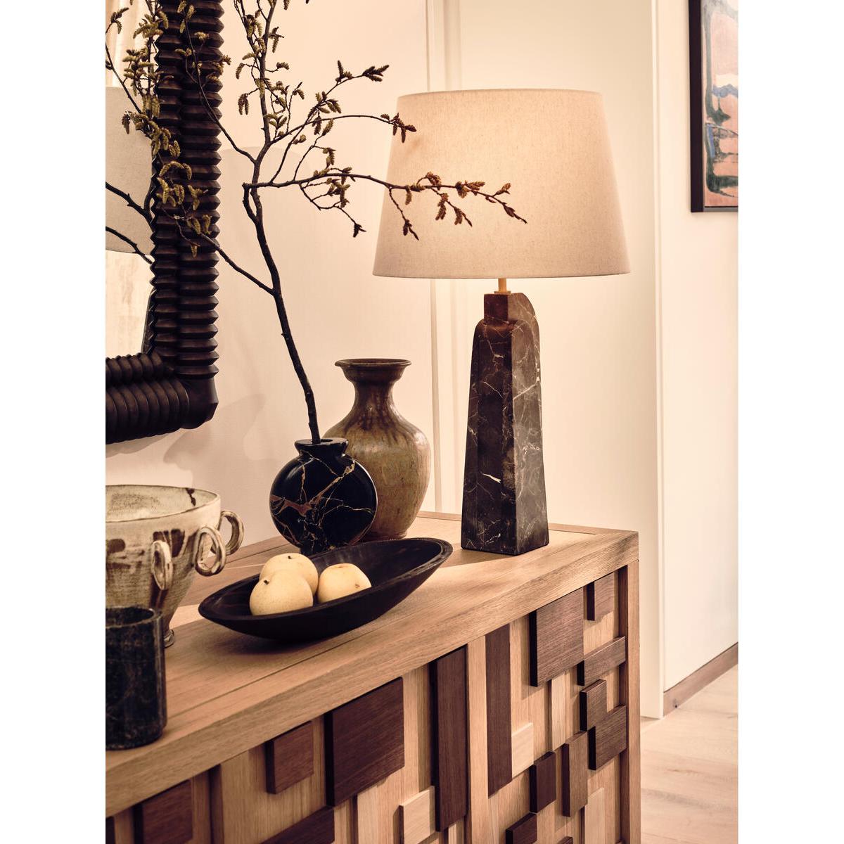 This sculptural lamp is carved from three brown marble panels with natural variations to create a truly unique base. Topped with a lined natural linen shade, the Darcy table lamp is complete with antique brass accents. Display it on a bedside table, or next to a sofa to welcome warmth and ambience into your home. Honed solid brown marble base Carved from three marble panels Sculpted design Antique brass detail Lined natural linen shade Dimmable Each piece is unique due to natural variations in the stone Inspired by Soho House Rome