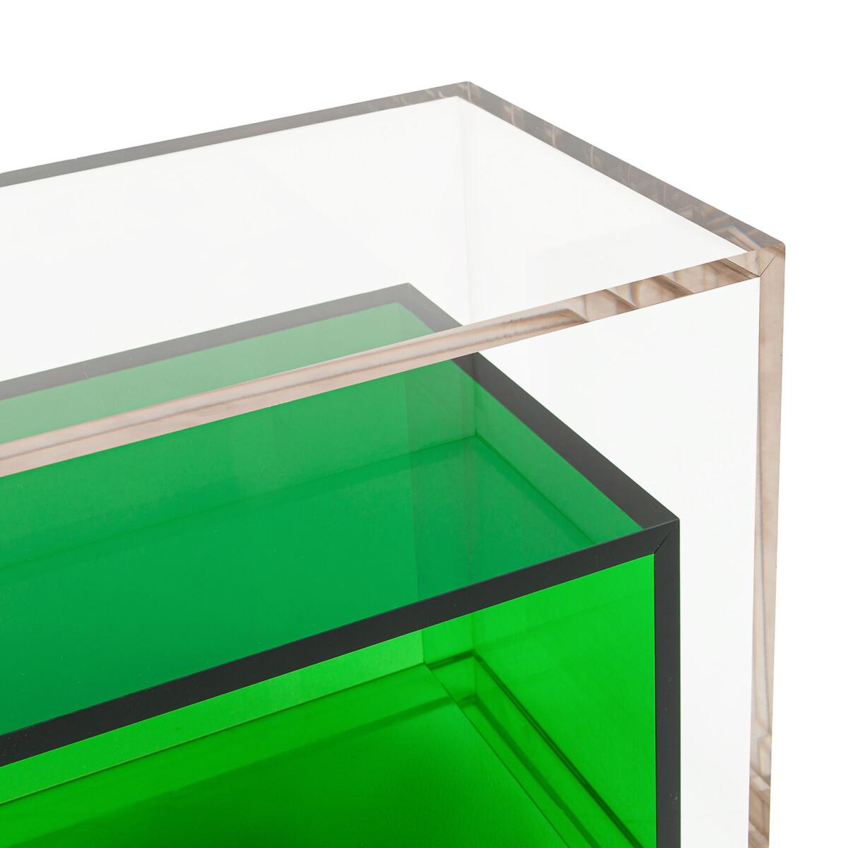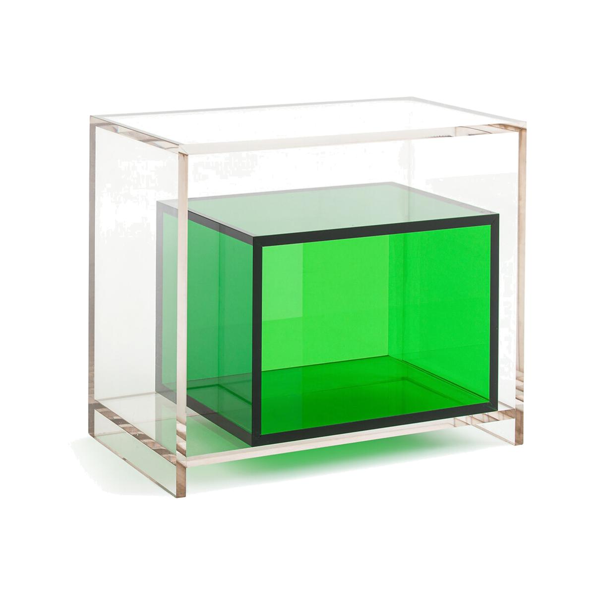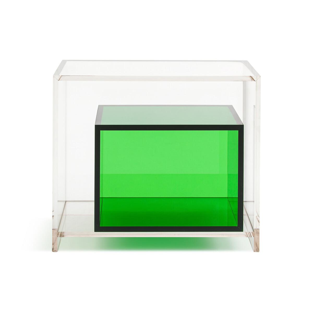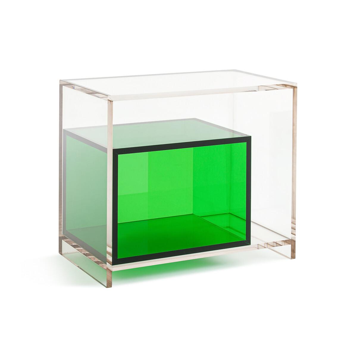 Inspired by 1970s design, the Dario bedside table plays with colour and transparency. This narrow contemporary piece can also be used as a console, bookcase or sideboard for an office..