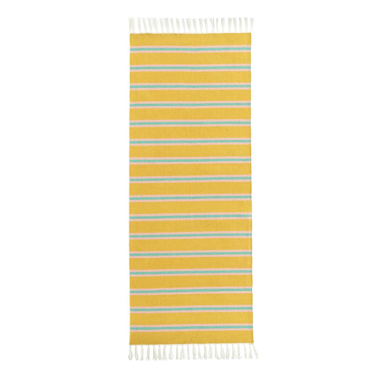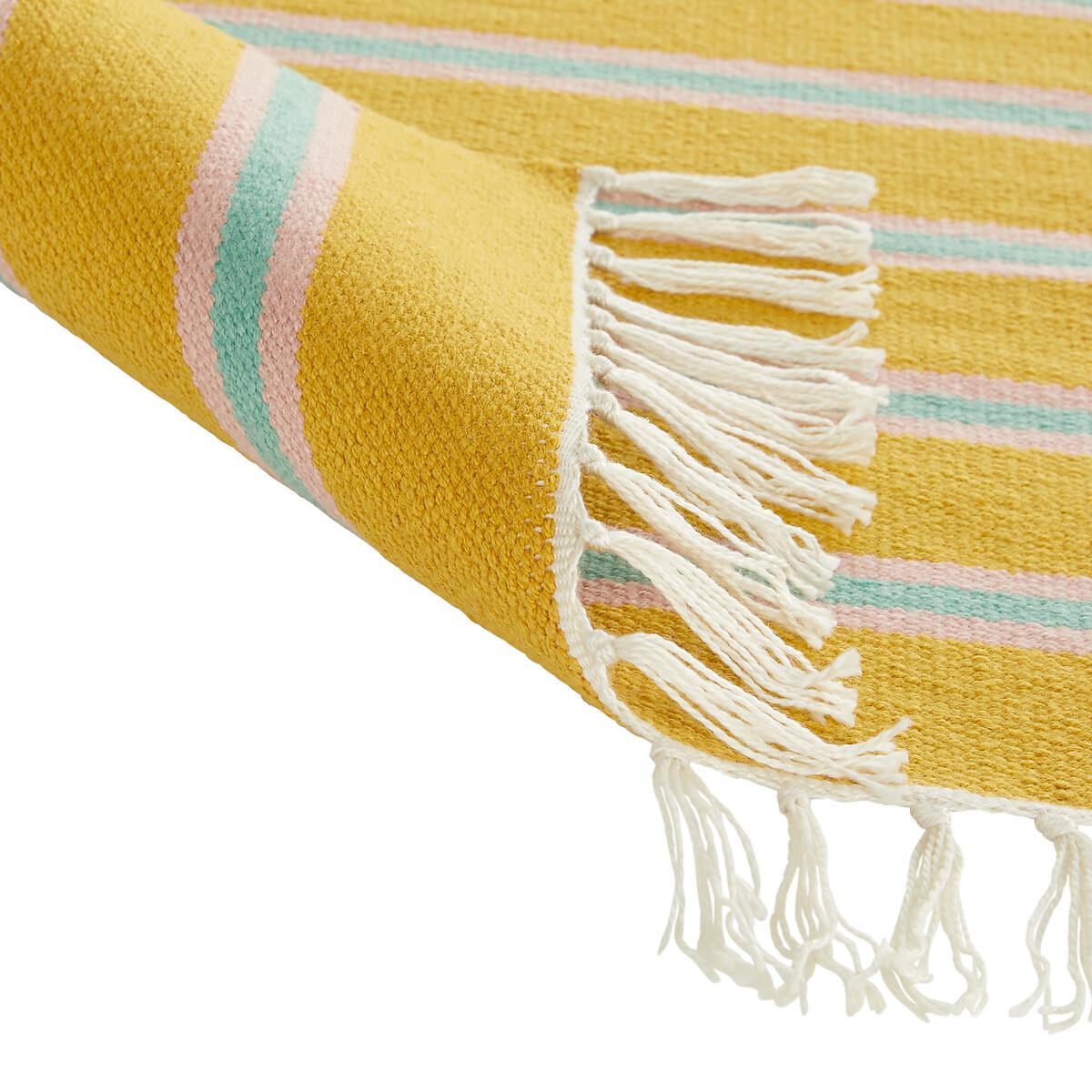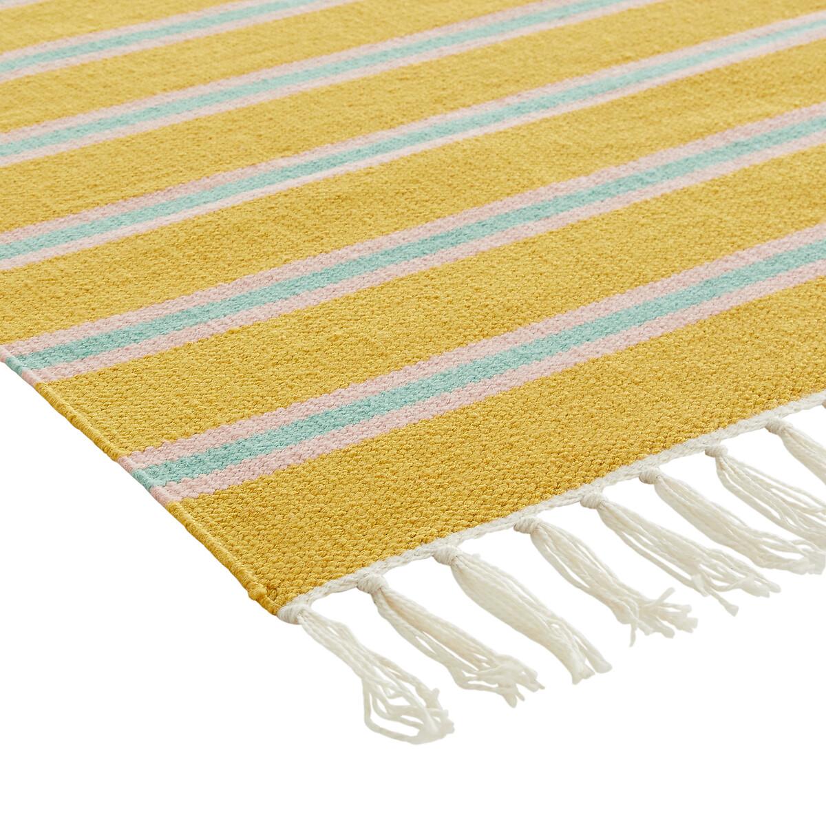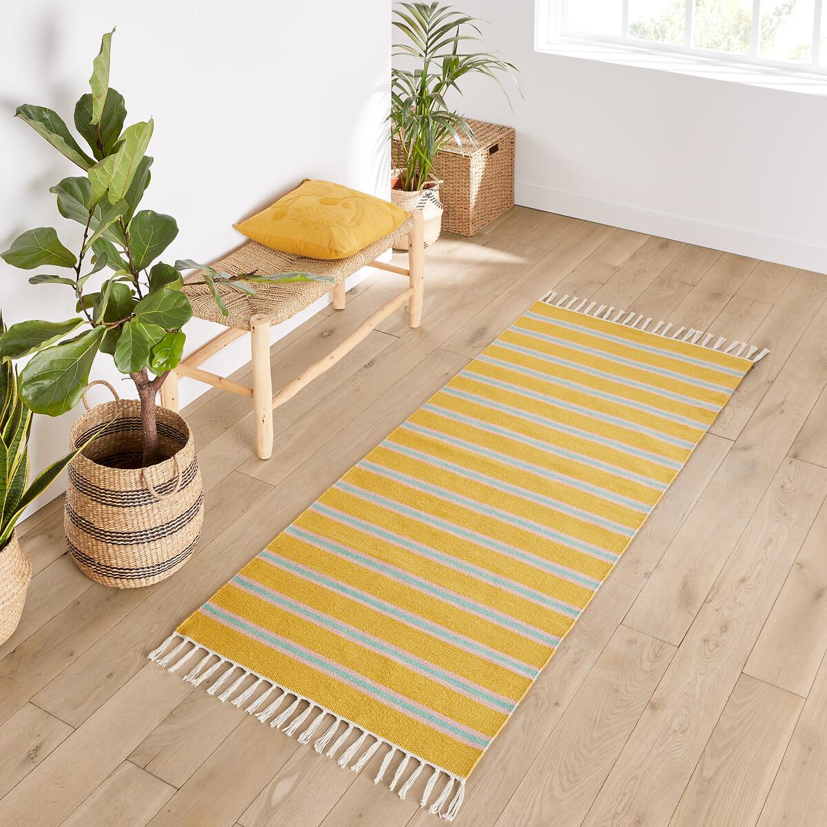 The carpet is undoubtedly the element that contributes the most to the atmosphere of a room. With its stripes worked in very modern tones, Darius brings its bohemian chic touch inside and outside the house. Its rectangular format adapts easily to all rooms and highlights a sofa or a bed. A signature design by La Redoute Interiors. This rug is made from recycled polyester. Product Details • 100% polyester • 1300g/m² • Fringed edging • Hand crafted • Indoor and outdoor. Care Advice • Vacuum regularly • To remove a stain, immediately dab the carpet with an absorbent tissue or damp cloth if necessary. For larger and deeper stains, seek professional service. Sizes • Width 80 x Length 150cm • Width 80 x Length 200cm • Thickness: 0.5cmDelivery:. Available for home delivery.