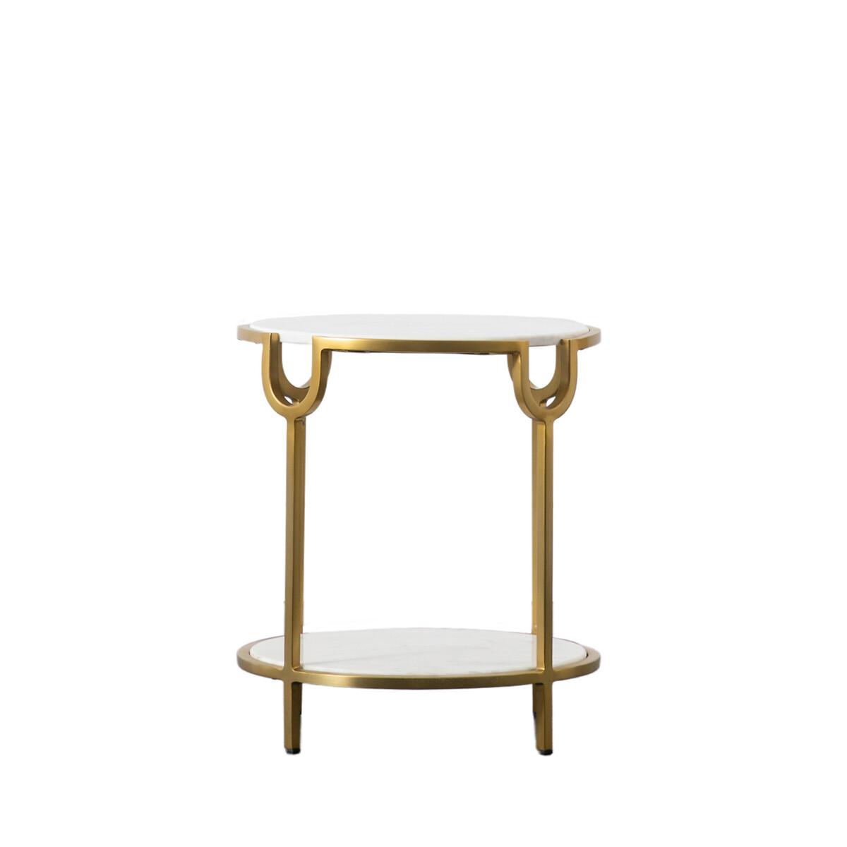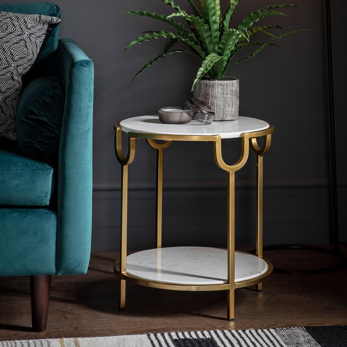 Add a touch of luxe to a room with this beautiful side table which combines natural stone with a metal frame to create this stunning piece. The frame features eye-catching design detail around the top to add interest and has a brushed brass finish, which pairs beautifully with the white marble. Product details. Partial assembly required (top and shelf)Product Composition - Iron / Baswara Marble Product Dimensions - 45 cm x 45 cm x 50 cm , Weight - 15.25 KGPackage Dimensions - 72 cm x 58 cm x 52 cm, Weight - 25.5 kg. This product will be dispatched by one of our trusted suppliers. You’ll be contacted by their selected courier about your delivery. Please note: this product cannot be delivered to all Offshore Islands, Northern Ireland or Republic of Ireland. GALLE01