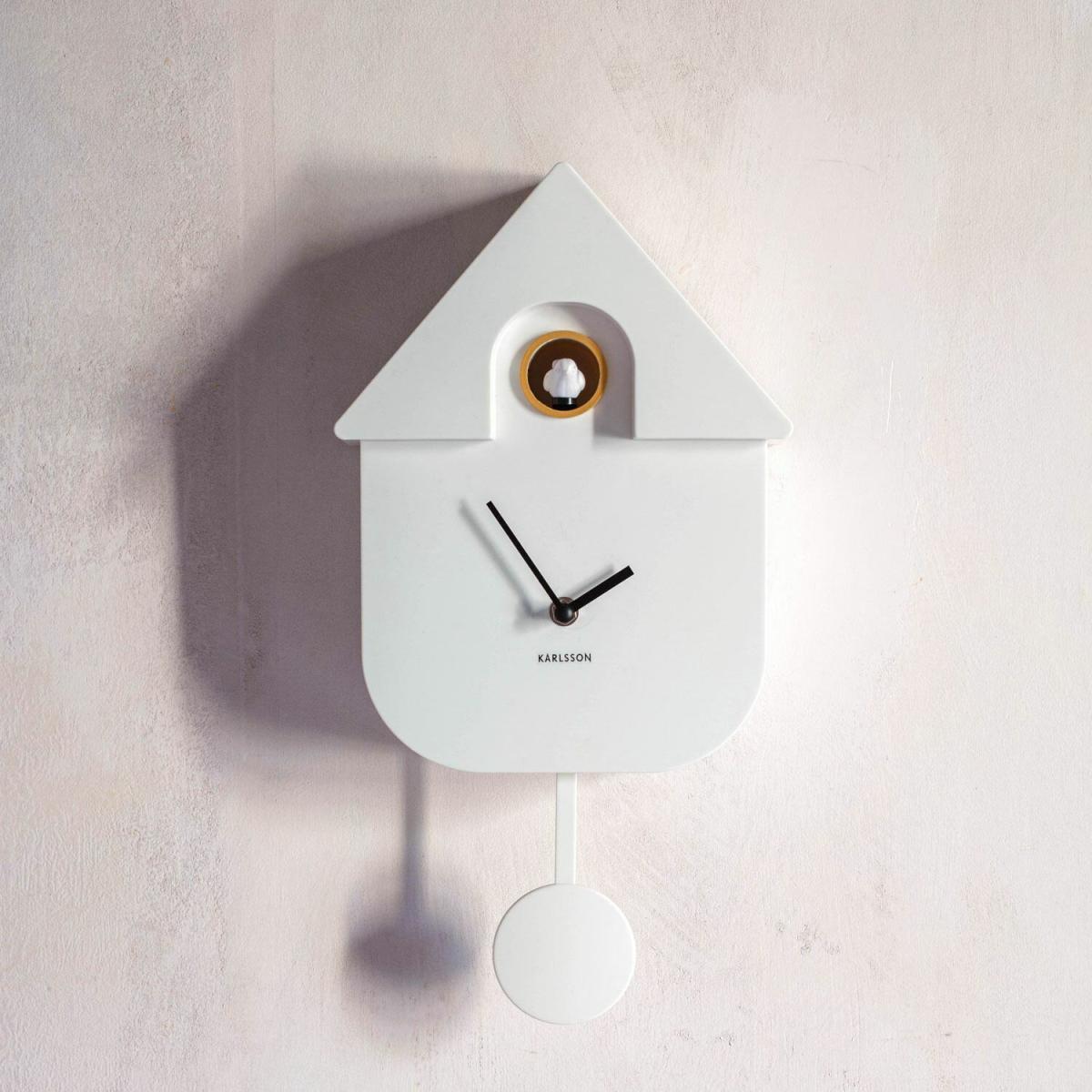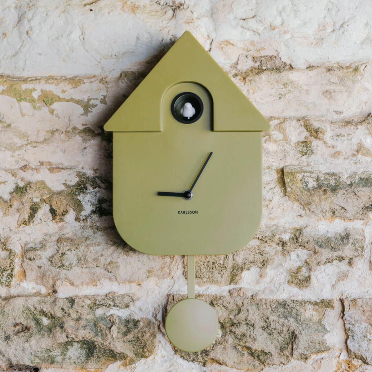 The traditional cuckoo clock gets a sleek modern update with these pendulum wall clocks that features a little bird that pops out on the hour. This clever clock is programmed to be silent at night so you're not kept up while the bird keeps watch. Black (PBF1002) Green (PBF1003) Olive Green (PBF1004) White (PBF1005) Red (PCM1000) Light Wood (PZI1022) Dark Blue (PZI1020) Ochre Yellow (PZI1021) H41 x W21. 5 x D8. 5cm. The clock is silent between 22: 00 and 06: 00. Bird features a small chirping noise. Requires 3 x AA batteries (not included).