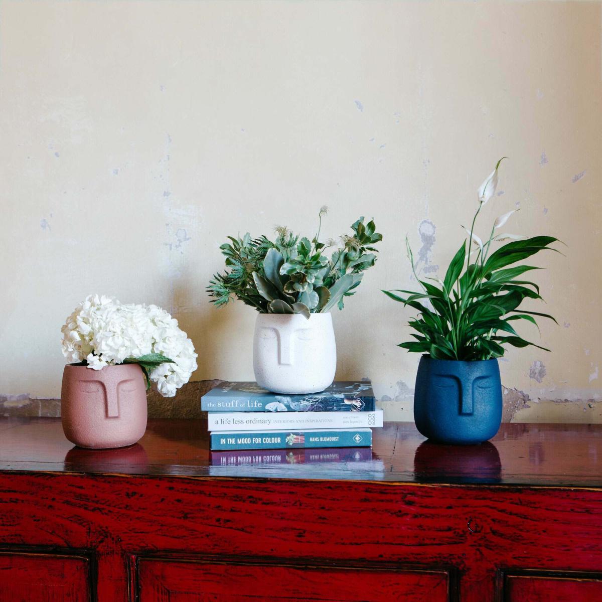 With a soothing peaceful look and a textured stoneware finish, this serene cement face planter keeps your plants growing strong. Available in white, clay brown or a dark midnight blue to provide a harmonious balance to your vibrant houseplant collection. Dark Blue (PVA1010). White (PVA1011). Clay Brown (PVA1012). H14 x Diameter 12. 5cm Made of cement. Suitable for indoor use only.