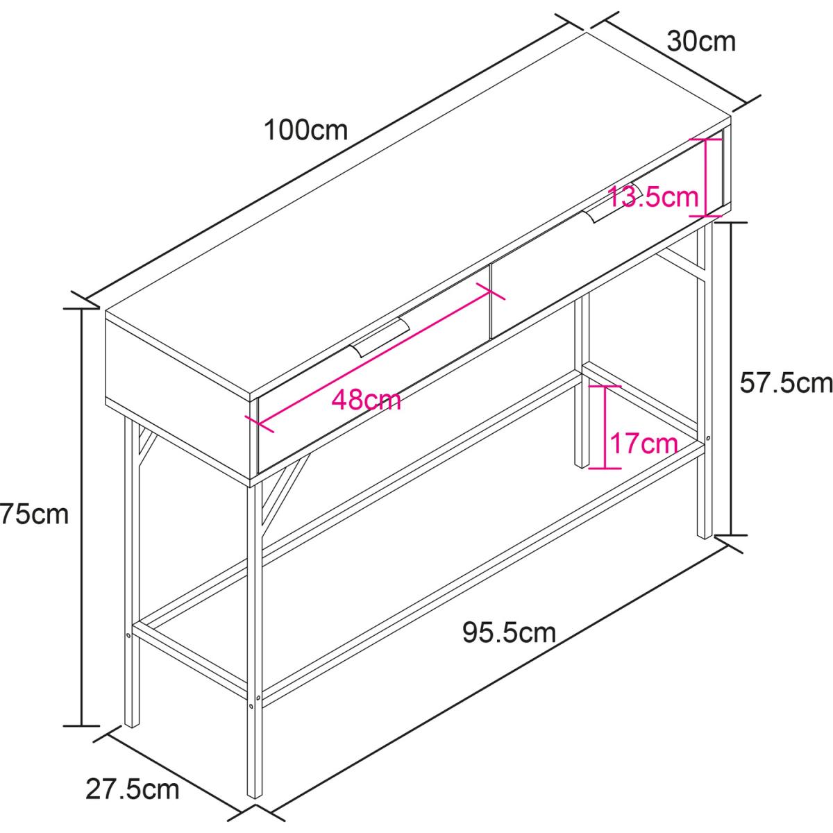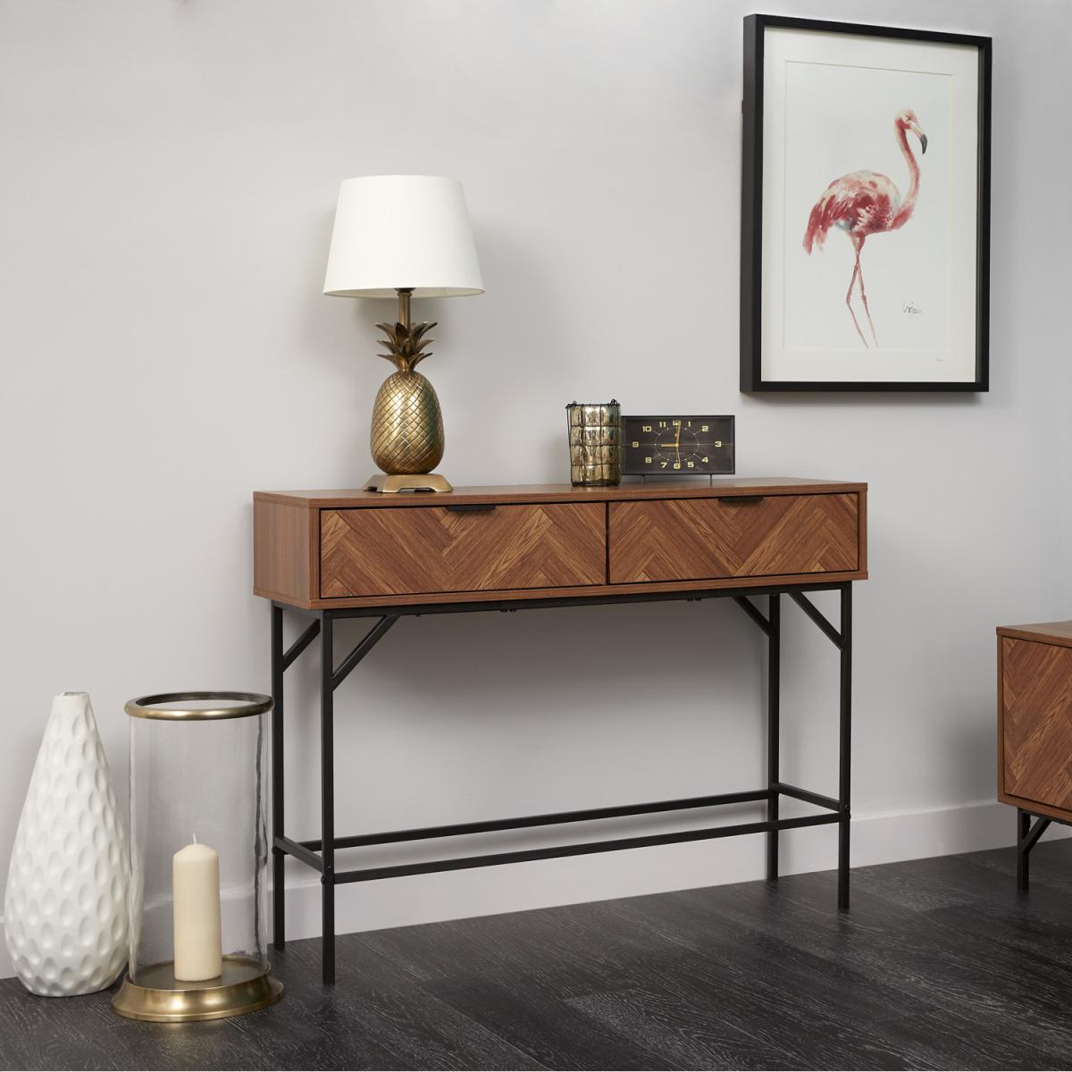 A classic take on a contemporary style, the Dark Chevron collection offers a modern take on your home and living furniture. Featuring two spacious drawers to the front with complimentary dark metal handles, the console table provides storage and style for hallways, living areas, bedrooms and more. Finished with black metal framed legs and a flat tabletop creating additional storage for your belongings.