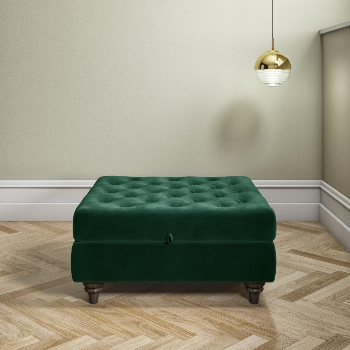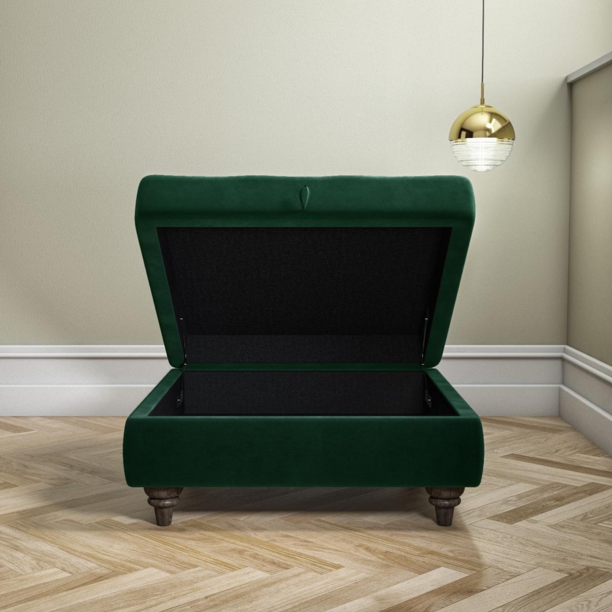 Features we love Stylish and elegant design perfect for updating your living space with an opulent touch. Beautifully upholstered in a plush velvet fabric with a deep buttoned top for a luxurious finish. Suitable for multiple different rooms in the home such as the living room bedroom or dressing room. Top lifts up via the tab-style tongue to reveal ottoman storage perfect for storing away clutter Solid dark wood feet adds a final display of elegance. The colour perfectly matches the Inez Clara and; Elba sofas! All about me. Combining style with storage this Inez square footstool has been beautifully upholstered in a plush velvet fabric with a button tufted top to give it an elegant and luxurious finish it'll make quite a statement in either your living room or bedroom. It's super soft to touch too and because of the short dense pile it's resistant to abrasion and easy to wipe clean with a damp cloth. Its dark wood legs add a final flourish of elegance. It's very practical and makes a versatile addition to any home. Use the versatile Inez footstool as an extra table an extra seat when guests visit or to put your feet up after a long day. Or use it in your bedroom by your dresser. It boosts a hidden Ottoman storage inner which has been fixed with an anti-slam mechanism so it'll stay open. It's perfect for storing your snuggly throw your favourite magazines remote controls and more. It can be used as an extra seat and it doubles as a gorgeous coffee table once you place a tray on top or you can just put your feet up and relax. There's very little assembly it's simply a case of fixing the legs. Why not match with the Inez sofa to complete the look. Need to know. Overall dimensions. H39.5 x W80 x D80 cm (including legs at 12 cm) Internal dimensions. H13.5 x W70 x D70 cm Colour. Green Finish. Velvet and solid wood feet Material. Wood construction (including eucalyptus wood) and velvet Assembly required. Yes some.