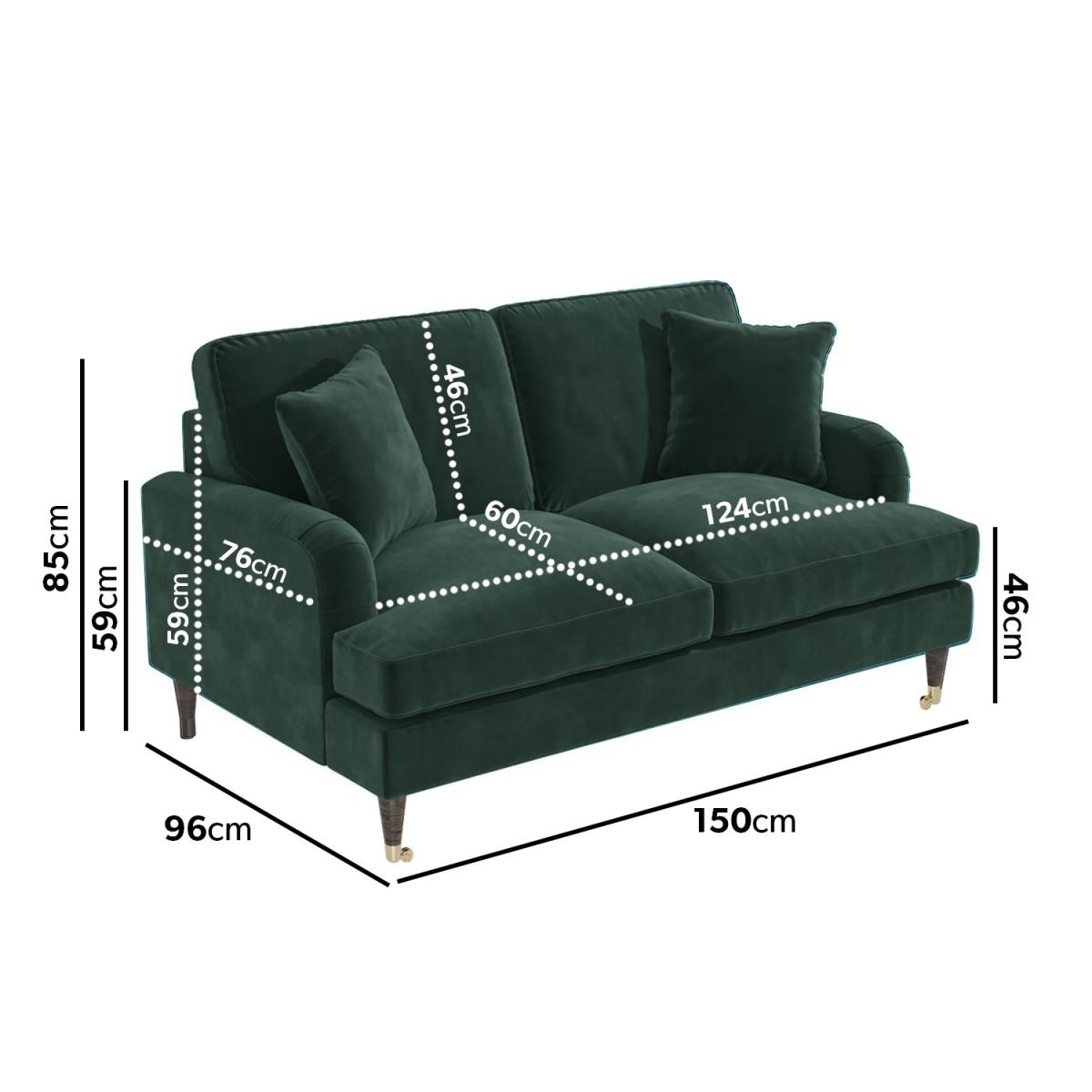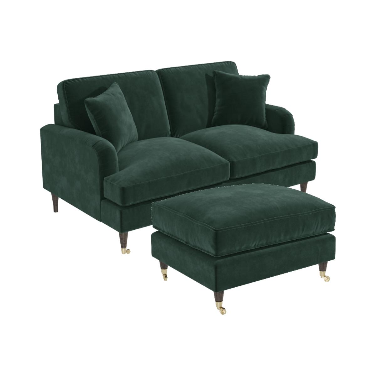 This bundle includes: 1 x Payton Dark Green Velvet 2 Seater Sofa 1 x Payton Dark Green Velvet Footstool Features we love Dark green velvet two-seater sofa and footstool The perfect modern addition to any living room Soft-touch plush velvet upholstery is right on trend Tailored piping and saddle arm detailing Dark wooden legs finished with gold castors All about me Lounge in ultimate comfort with our Payton two-seater sofa and footstool set in dark green. All the cushion covers, including the two scatter cushions, are removable and easy to wipe clean. Filled with spongy foam, the sofa and footstool make the perfect place to relax after a long day. Both items are easy to assemble; simply screw on the legs. Need to know Two-seater sofa Dimensions:W150 x D96 x H85 cm Packaging dimensions:W152 x D98 x H61 cm Weight: 50kg Colour:Dark green, dark wooden legs, gold castors (front legs only) Finish: Upholstered Material: Velvet (100% polyester), wooden frame and legs and metal castors (front legs only) Filling: Foam Assembly required: Yes - just attach the legs Footstool Dimensions: W75 x D62 x H44 cm Packaging dimensions: W77 x D64 x H31 cm Weight: 10kg Colour:Dark green, dark wooden legs, gold castors Finish: Upholstered Material: Velvet (100% polyester), wooden frame and legs and metal castors Filling: Foam Assembly required: Yes - just attach the legs