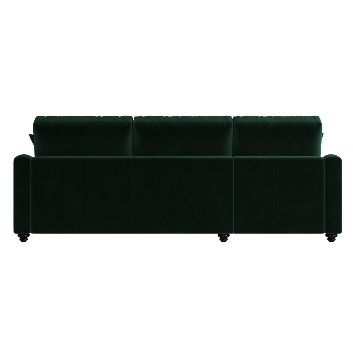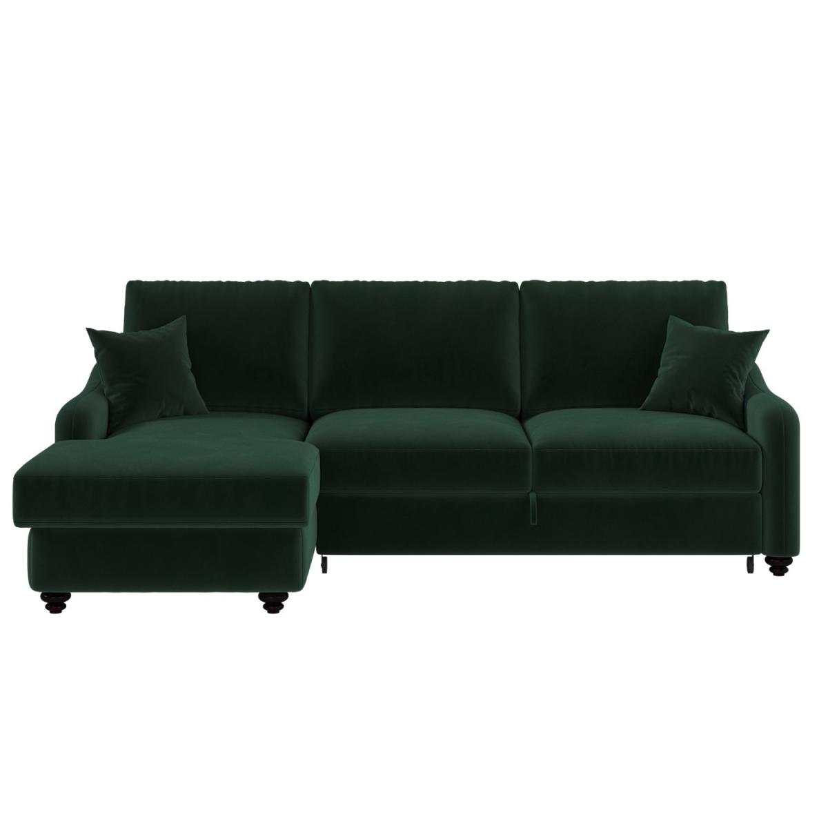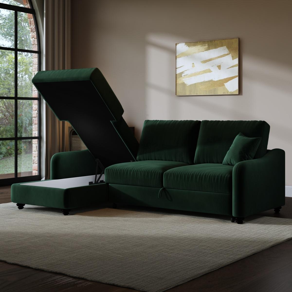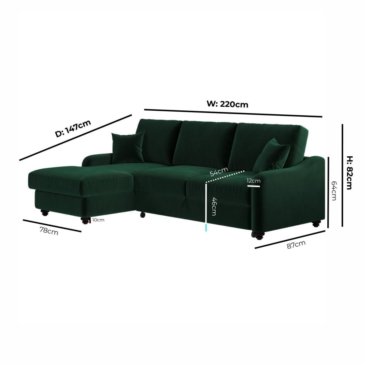 Foam filled Upholstered in rich dark green velvet, it adds a bold, elegant statement to your living space while remaining timeless and versatile. Generously seats up to four people, perfect for lounging or relaxing with family and friends. The built-in compartment under the chaise keeps extra bedding, pillows, or blankets neatly stored and out of sight. The smooth pull-out mechanism allows you to convert the sofa into a cosy bed in seconds, perfect for accommodating overnight guests. Reversible and removable back and scatter cushions make it easy to plump and maintain for maximum comfort. Comes with two matching scatter cushions for added support and style. Elevate your living space with the Quinn Left-Hand Chaise Sofa Bed – a luxurious fusion of comfort, style, and functionality. Upholstered in rich dark green velvet, it brings an elegant, refined touch to any room. Designed to seat four comfortably, it offers generous space for lounging during the day and easily converts into a cosy bed at night, making it perfect for hosting overnight guests. The smooth pull-out mechanism ensures a hassle-free transition, while the hidden storage beneath the chaise keeps bedding and blankets neatly tucked away.