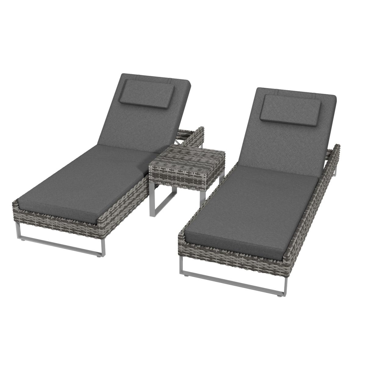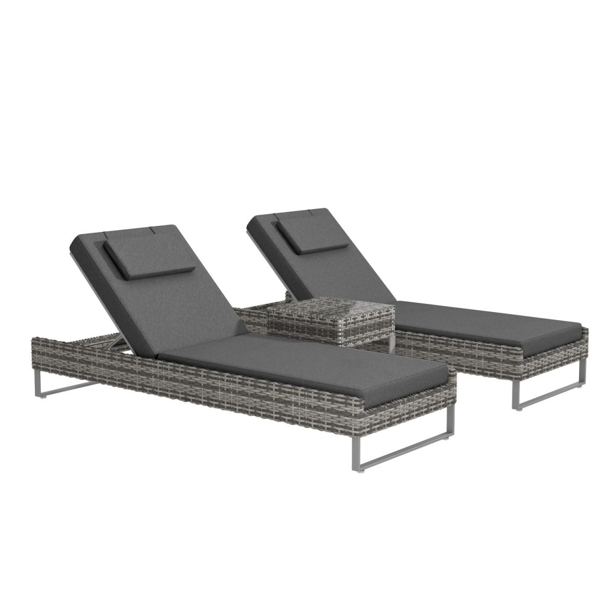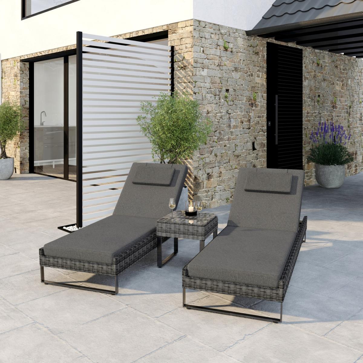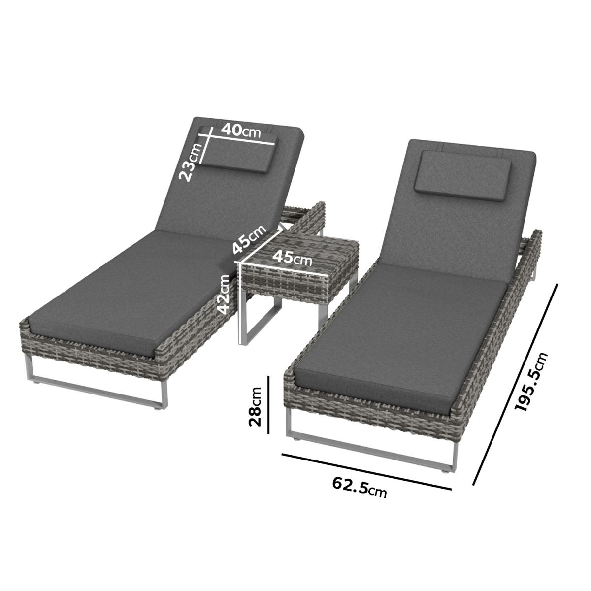 Features we love Luxurious pair of sun loungers and handy side table5-position reclining backrests from flat to upright. Made from synthetic weather-resistant handwoven rattan Table features a clear tempered glass top for durability. Complete with water-resistant seat back and; head cushions All about me. Create the perfect home spa experience either out in the garden or besides an indoor pool with this matching pair of sun loungers. Choose to fully recline and lay flat to soak in the sun’s rays or sit up and delve into a good book. You could even push the two together to create a daybed*. Accompanied by a matching side table to place your cold beverages you’ll be set up for the day. Made with synthetic all-weather rattan it’ll withstand sun mould and unpredictable British weather. Enhance the life of your garden furniture-. This product has been designed to be used outdoors. To make the most of your furniture we recommend that you store it indoors move it in a sheltered position or protect it by covering it up in bad weather and over the winter period. Why not invest in one of our garden stores super handy if your furniture comes with any upholstery (cushions) which must always be kept dry. Need to know. Sun lounger dimensions. W195.5 x D62.5 x H28 cm (frame only not upright) Table dimensions. W45 x D45 x H42 cm Table top thickness. 5mm Cushion thickness. 8cm Colour. Dark grey mix and grey (upholstery) Finish. Woven flat rattan upholstery and powder coated metal (frames) Material. Synthetic rattan aluminium frame tempered glass and fabric (cushions) Assembly required. No Due to the hand-woven rattan finish each piece will feature slight variations in colour and pattern.*Please note When pushed together as a daybed there is a ledge at either side so there will be a slight gap. What's in the box? 2 x Sun loungers1 x Table2 x Seat cushions2 x Back cushions2 x Head pillows.