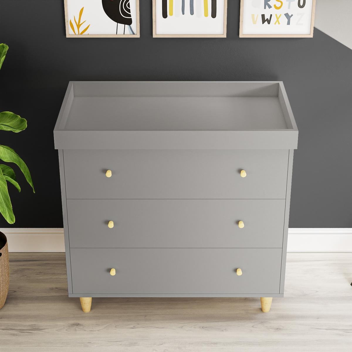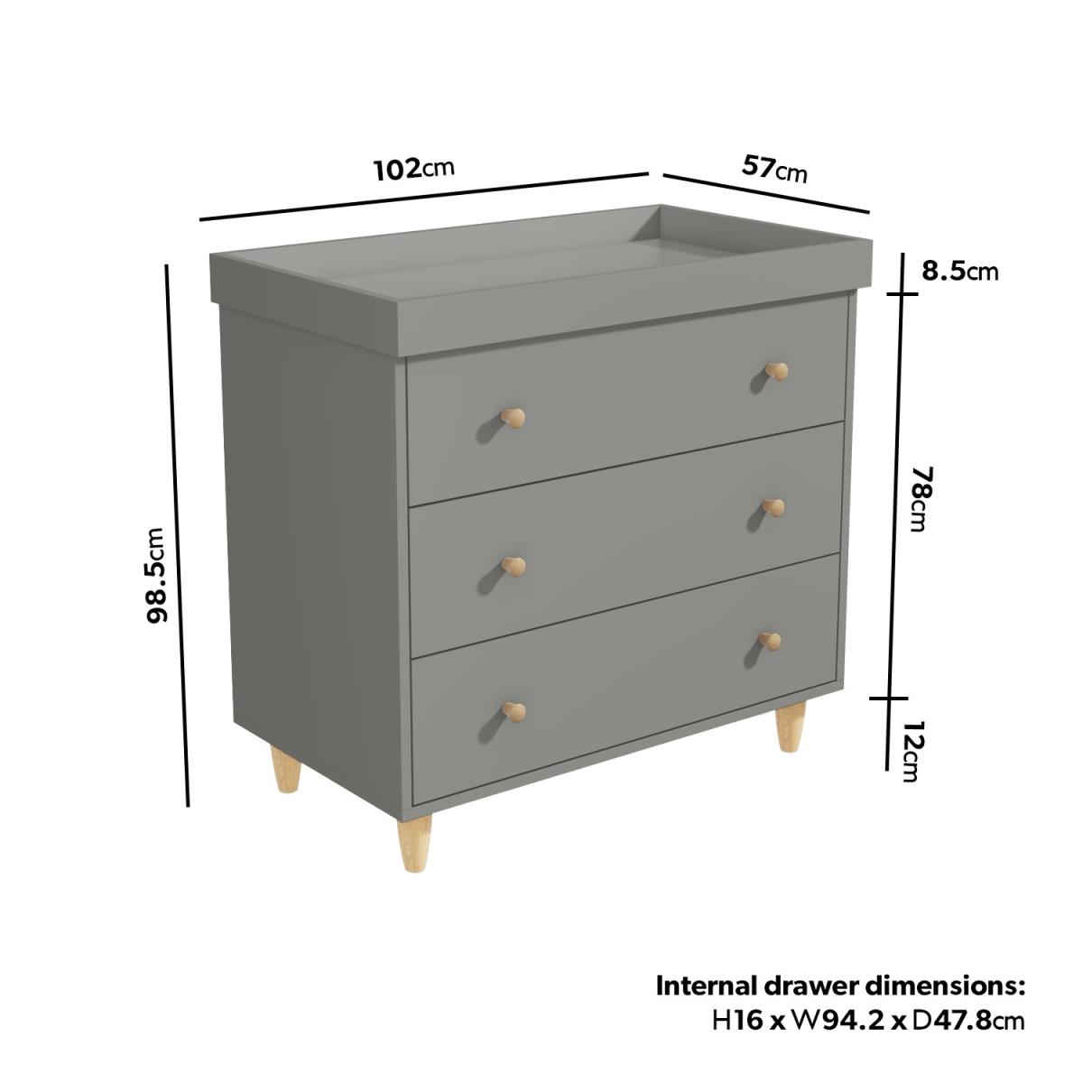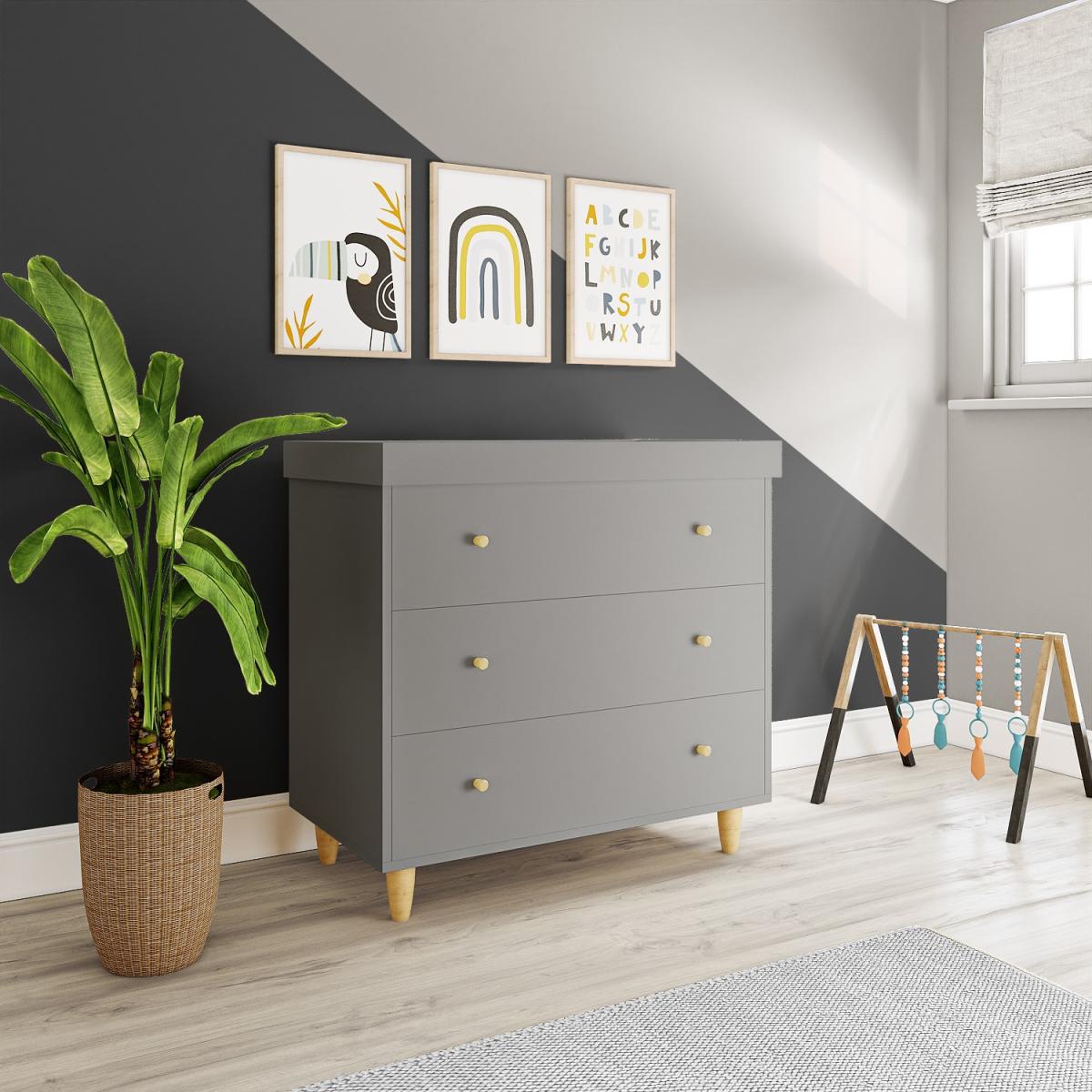 Changing table provides extra space to change your baby Convert to a dresser when the changing tray is removed Create a stylish Scandi-inspired look to any nursery Grey finish with contrasting pine handles and legs The three drawers offer plenty of room to store items Soft closing drawers are ideal when baby is sleeping Made from sustainably sourced New Zealand Pine Changing station suitable for use up to 12 months Matching cot bed / junior bed available Need to know Packaging weight: Box 1: 36.5kg / Box 2: 28 kg Number of drawers: 3 Product weight: 64.5kg Colour: Dark grey and natural pine Finish: Painted and natural Material: Solid pinewood For use: Indoors Includes: Anti-tilt strap for the wall Assembly required: Yes Conforms to European safety standard EN 716:2008+A1:2013 and British safety standard BS 8509:2008+A1:2011