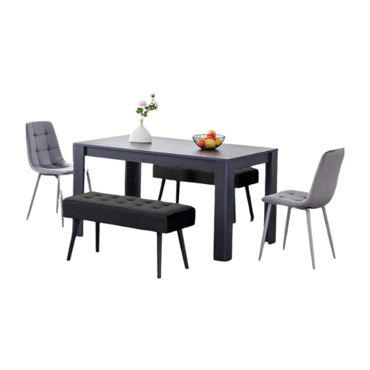 A stunning wooden dark grey arrow design Dining Table set included set of 2 tufted velvet grey rocco chairs with slightly curved back design, and 2 Benches. The chic black dining bench includes a soft black velvet padded seat with stylish stitching and tufting The dining table colour is dark grey color with a hint of charcoal. The dining chairs colours are grey with slightly curved back design for fitting with body shape. The padded seat features elegant stitching and tufted details, giving it a modern yet cosy look The dinner table is crafted with high-quality MDF, and a melamine laminated finish to ensure a durable, long-lasting tabletop. The dining chairs are made of premium velvet with metal chair legs. With sturdy metal legs, this bench is built to last and blends easily with any decor Dimensions The dining room chairs sizes are H87 x L59 x W44 cm. Dining table size is H75 x L117 x W77 cm. The seat height of the chair is 45 cm. Bench Size is 90cm (L) X 36cm (W) 47cm (H) Straightforward assembly is supported by clear instructions for our dining table set Features. The Dining set includes a table, 2 high-quality chairs, and 2 Benches. Dining table made of high-quality MDF and a melamine laminated finish. Chairs material is premium velvet with metal chair legs. Legs prevent damage with the adjustable foot protection provided. Chair Size H87 x L59 x W44 cm. Table Size H75 x L117 x W77 cm. Bench size 90cm (L) X 36cm (W) 47cm (H).The seat height of these chairs is 45 cm. Convenient format with instructions for easy assembly.
