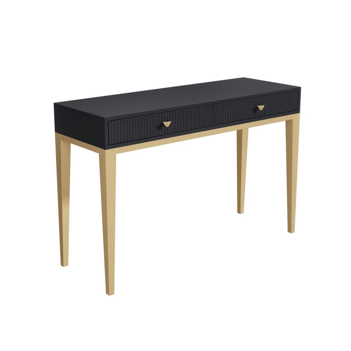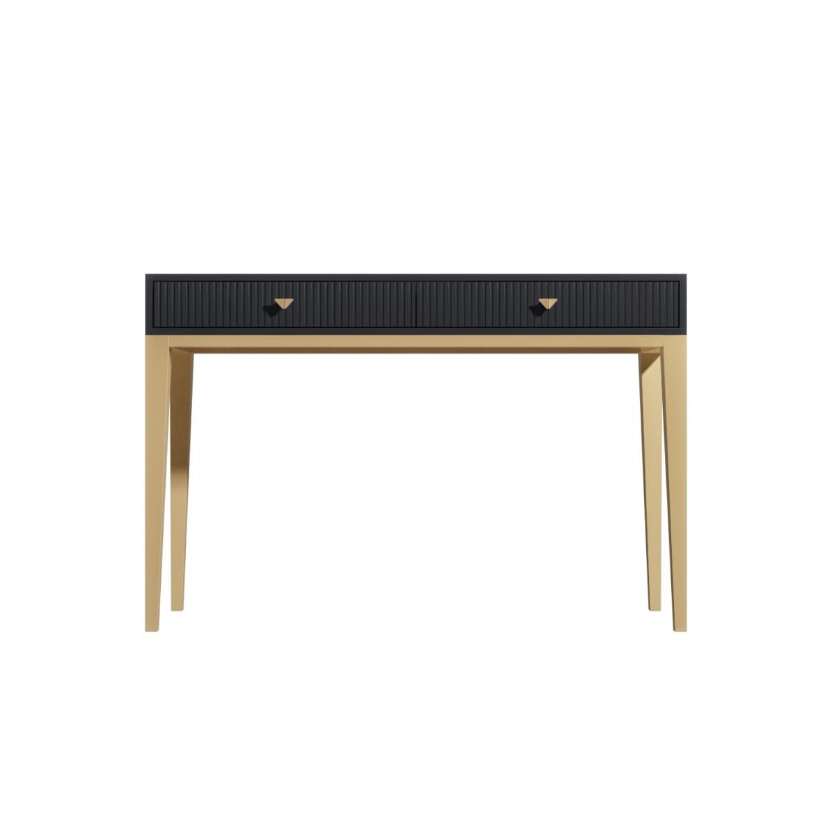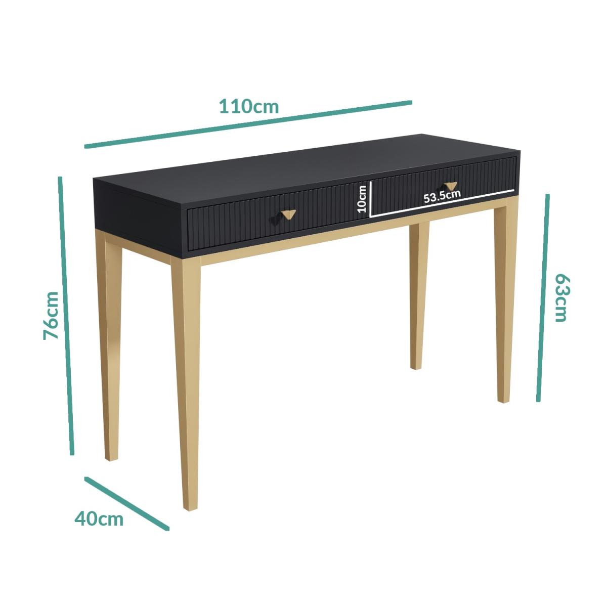 Give your bedroom an instant style injection with this beautiful art-deco inspired dressing table. With grooved drawer fronts, eye-catching geometric drawer handles and contrasting brass-coated tapered legs; it has an effortlessly chic appearance. It features a hand-finished design crafted from solid mango wood and comes beautifully painted in dark grey. It's perfect for any bedroom setting. It offers two spacious drawers for quick access to make-up and all your essentials. The top provides plenty of room too, perfect for placing perfume bottles and cosmetics. Delivered as a solid piece means there's no assembly either so you can use it right away.