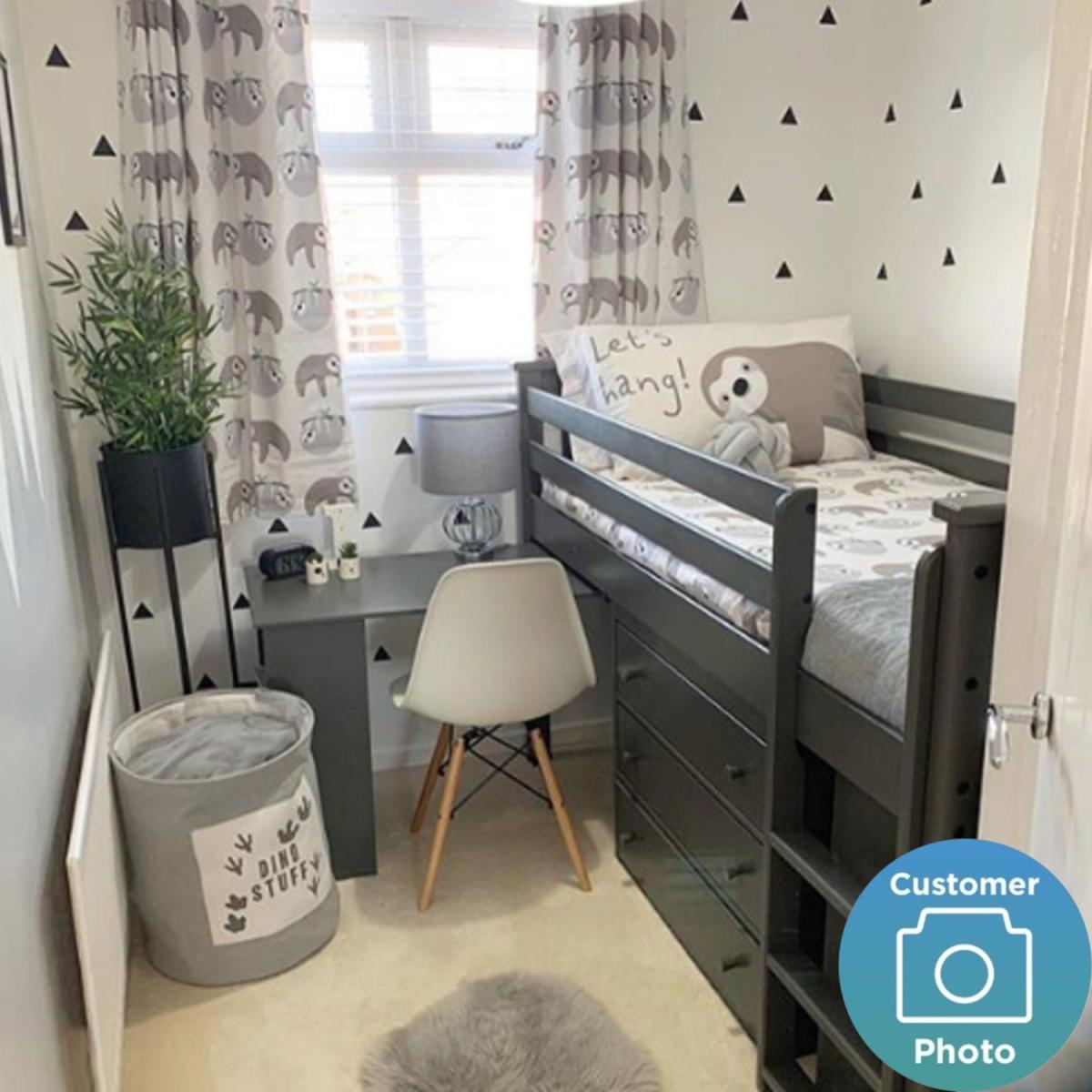 Features we love Simple grey finish and unisex design. The compact design is great for saving space. The pull-out desk is ideal for creative projects. Desk is on castors for easy manoeuvrability Ladder can be fitted to either side Use our deal to save 10% on selected mattresses All about me. If you're looking for the perfect solution to save space in your child's bedroom then the Windermere Mid Sleeper is ideal for you. Putting all their bedroom furniture together into one compact piece this convenient design leaves floor space for your kids to play however big their room is. With a simple grey finish this bed is great for boys and girls suiting many decoration styles and colours. Featuring a raised bed with a reversible ladder this mid sleeper is perfect for any room layout. Underneath it offers a chest of three drawers and a two shelf bookcase which are both freestanding and can be swapped around for easier access. That also means cleaning is less of a chore too!There's also a pull-out desk so your kids can do their homework in peace without permanently taking up vital floor space. With two shelves built-in here too it adds even more storage space. The bed fits a standard UK single mattress (90x190cm) – this isn't included so you have the freedom to select a mattress of your choice. Built using a combination of both solid pine and MDF components the Windermere Mid Sleeper will stand the test of time and handle the vigour of kids at play no matter how boisterous! It is delivered flat-packed meaning self-assembly is required. We'd recommend two people work together to do this due to the item's size. Need to know. Dimensions. W200 x D101 x H116.8 cm Chest of drawers. W83.8 x D40.6 x H69 cm Bookcase. W83.8 x D40.6 x H69 cm Desk. W93.5 x D50 x H67.3 cm Max Weight Capacity. 80 kg Material. Wood Finish. Grey Assembly required More info Mattress height should not exceed 18cm Compact space saving design. All the furniture underneath is freestanding arrange it to suit your needs. Assemble the ladder to the left or right side to suit your space Desk sits on castors to easily store away when it's not needed. Chest of three drawers with classic round handles. Solid top bunk safety rail Combination of pine and MDF components withstand the test of time Wooden slatted bed base. Fits a standard UK single mattress (3ft/90 x 190cm)Self-assembly required. More colour options available.