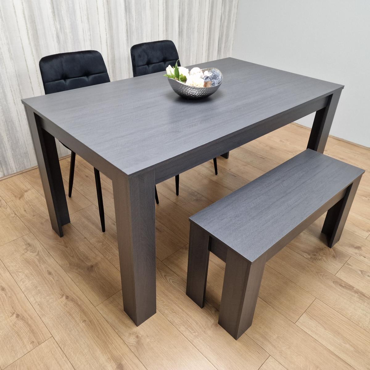 Enhance your dining area with our stylish Dining Set. Crafted from high-quality MDF in charcoal effect, this set effortlessly combines aesthetics and practicality. The dining set features a sleek charcoal effect tabletop with Arrow effect, making it a versatile addition to your dining space. Whether it's a family meal or a casual get-together, this table provides a solid foundation for your dining needs. Included in the set are two matching Tufted Black Chairs for touch of sophistication and easy cleaning. The chairs rest on sturdy metal legs with great strength and durability with adjustable foot protection, ensuring stability on various floor surfaces. This practical feature ensures that your dining experience is comfortable and wobble-free, the chairs seats and back rest are extra padded cushioned for extra comfort when you sit on. Completing the set is a matching bench, measuring 90 cm (Length) x 30 cm (Width) x 45 cm (Height), offering extra seating space with a coordinated look. Easy-to-follow instructions ensure a hassle-free setup, so you can start enjoying your new dining set in no time.