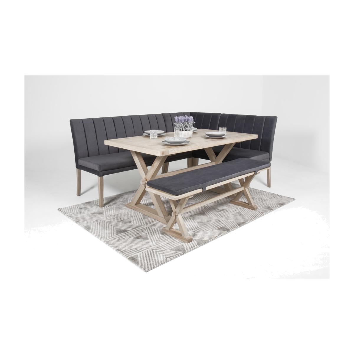 Dimensions Table W160 x H77 x D90 cm Bench W158 x H97 x D220 cm. The Valent corner dining set will create the perfect place for hosting dinners for friends and family in your kitchen or dining room. The dining bench features a padded grey seating on a solid wooden frame while the dining table is made from solid oak and oak veneers ensuring the set will last the test of time. Features. The Valent table is made from solid oak and oak veneers. The bench features a solid wooden frame and leg Grey fabric upholstered dining bench seat. Comfortable padded seat. Complete corner bench. Stunning cross-legged based table Assembly required..