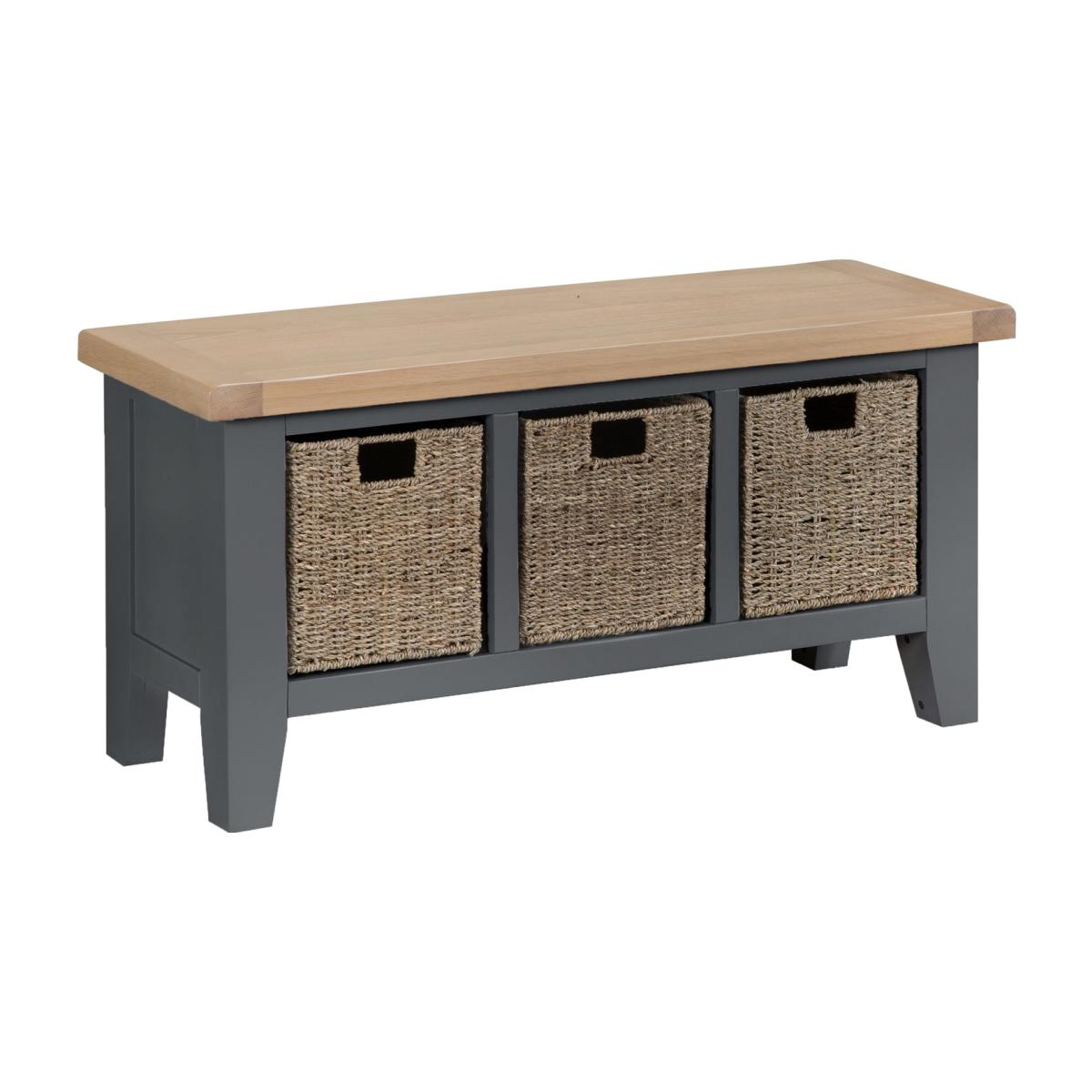 The Pegasus hall way bench has three wicker baskets and chunky contrasting gently lime washed tops, this charcoal painted collection blends classic and Contemporary influences for a style all of it's own.