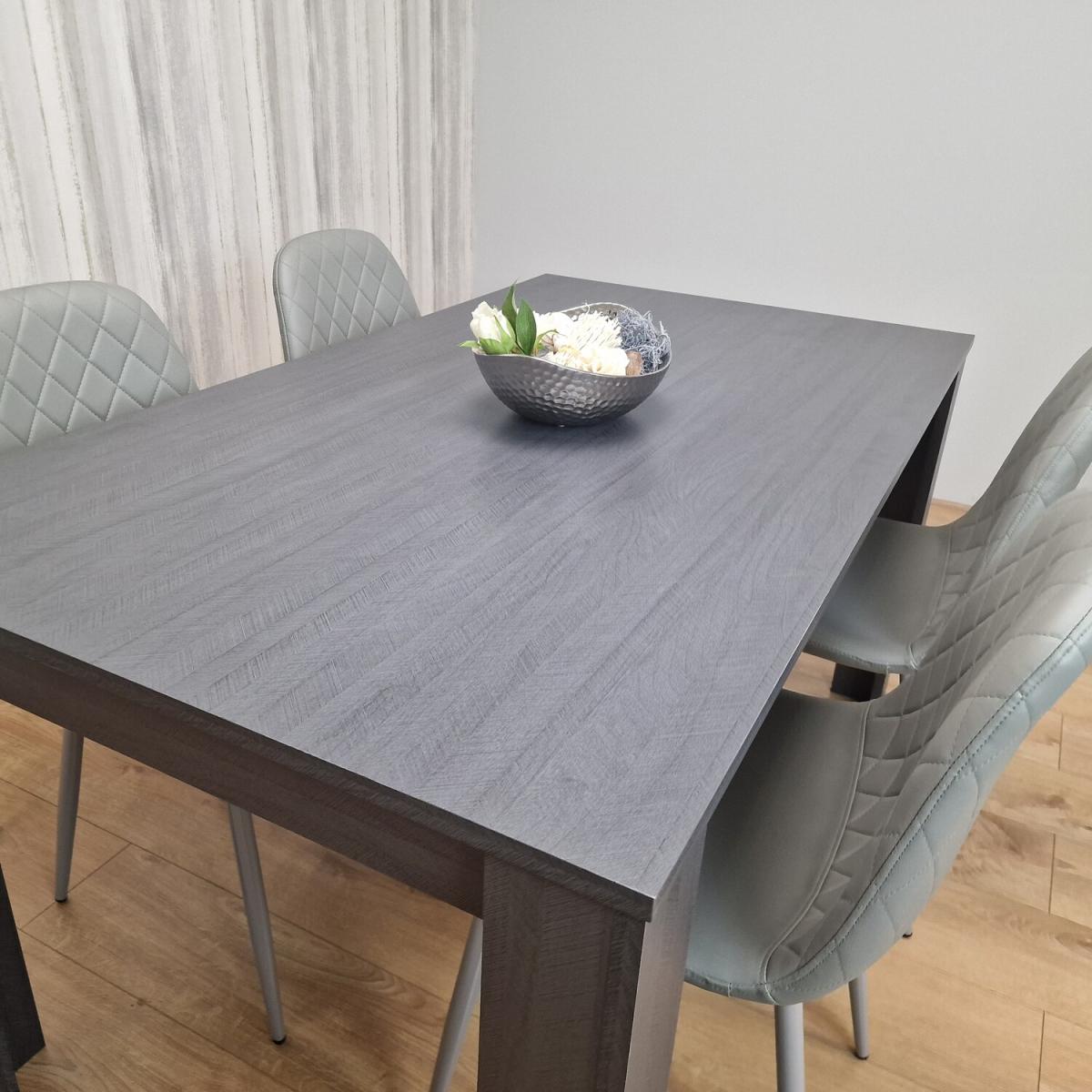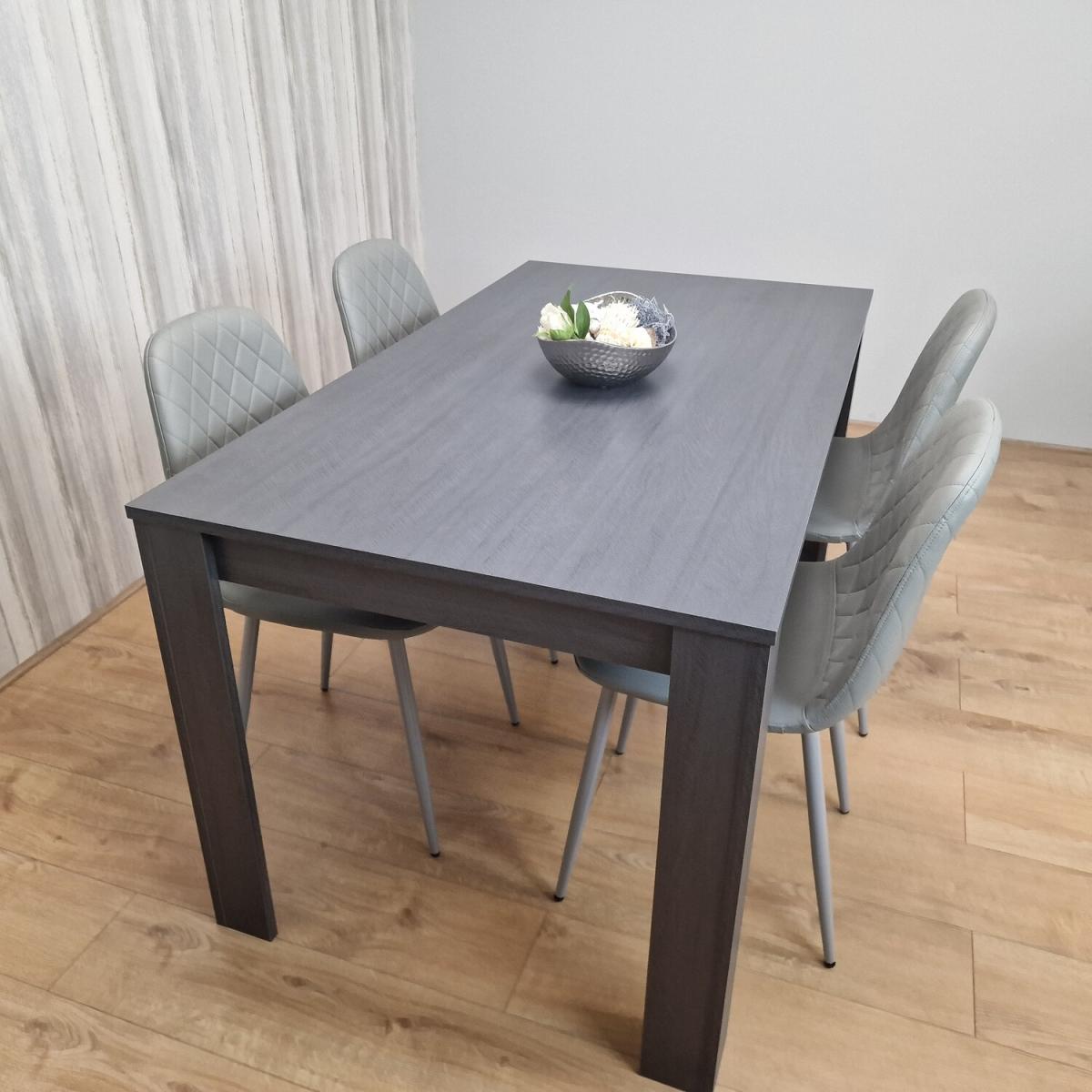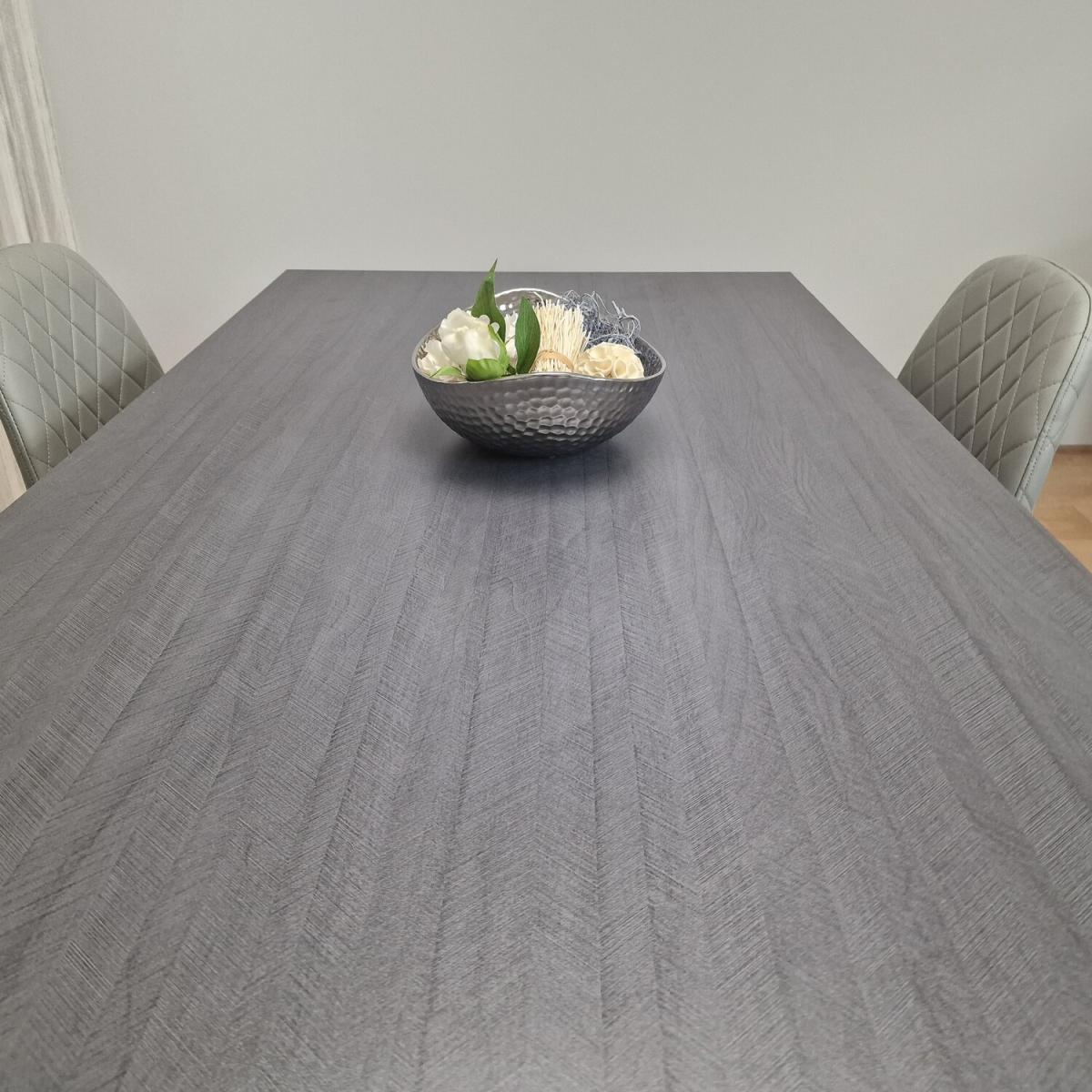 Enhance your dining area with our understated yet stylish Dining Set. Crafted from high-quality MDF in Dark Grey Colour with Arrow effect, this set effortlessly combines aesthetics and practicality. A sleek dark grey tabletop with Arrow effect, making it a versatile addition to your dining space. Whether it's a family meal or a casual get-together, this table provides a solid foundation for your dining needs. Included in the set are four Grey Chairs upholstered in faux leather for a touch of sophistication and easy cleaning. The chairs' distinctive feature is the diamond pattern stitching on the backrest, adding a hint of elegance to your dining area. The chairs rest on sturdy metal legs with adjustable foot protection, ensuring stability on various floor surfaces. This practical feature ensures that your dining experience is comfortable and wobble-free. This dining set is conveniently shipped in a flat-pack format, allowing for straightforward assembly upon arrival. Easy-to-follow instructions ensure a hassle-free setup, so you can start enjoying your new dining set in no time.